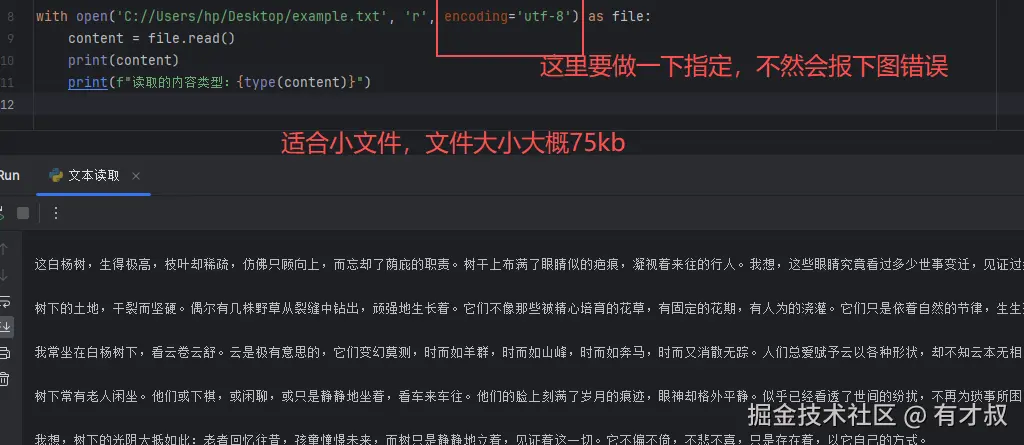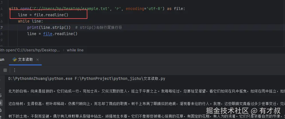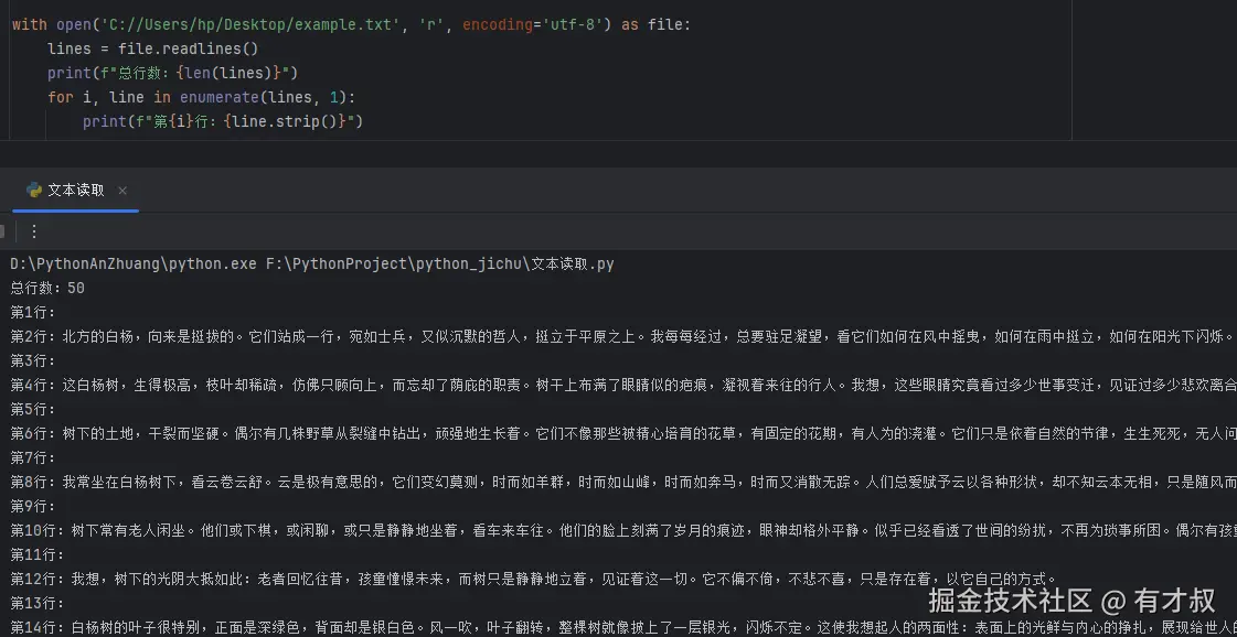 with open('C://Users/hp/Desktop/example.txt', 'r', encoding='utf-8') as file: