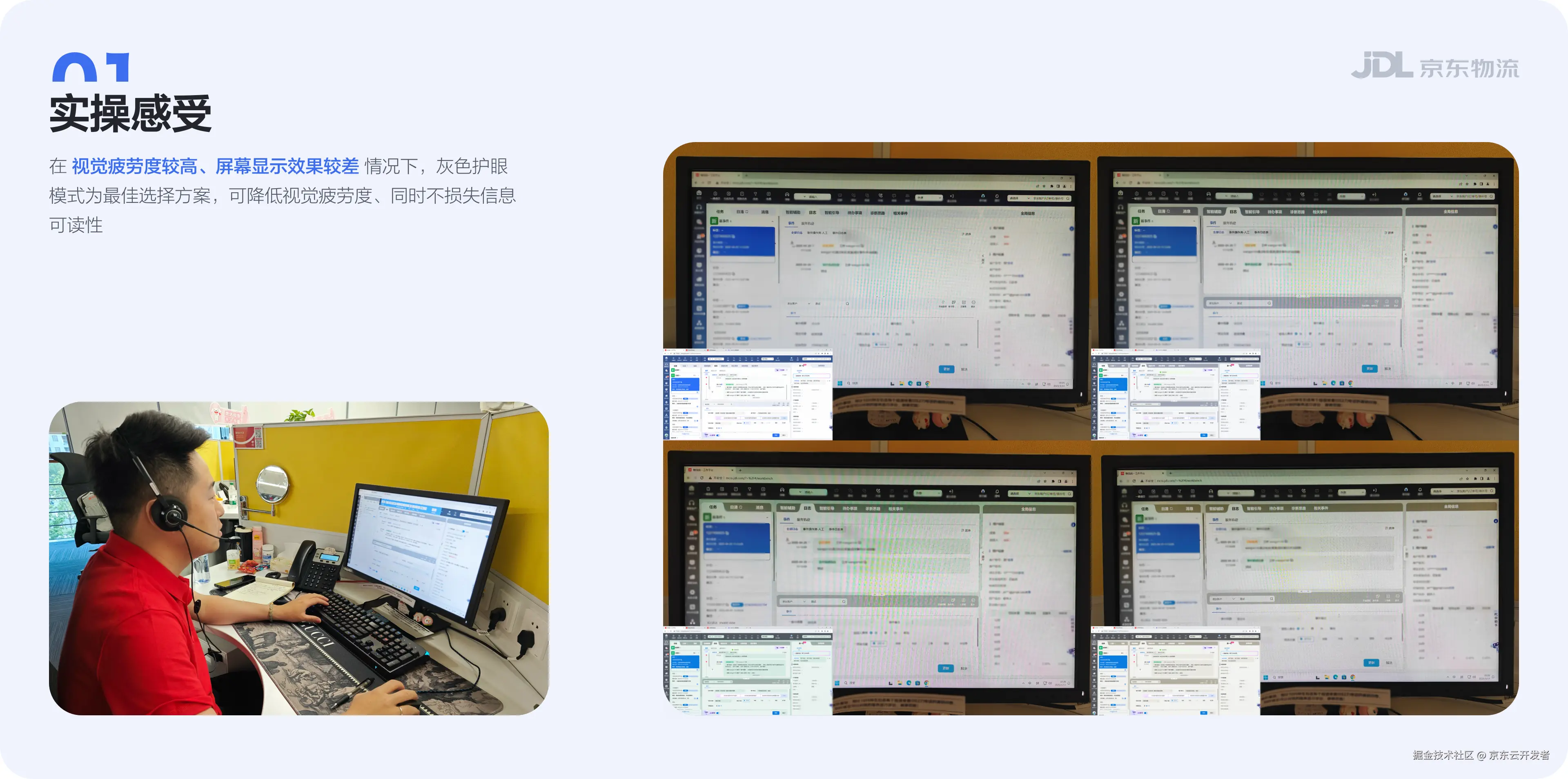 聚焦客服工作台,研究在白天室内作业及夜晚室内作业下,界面颜色、环境光线、使用时间对视觉舒适度的影响,设计一套针对物流作业场景下的B端护眼模式,提升一线用户的使用效率及视觉舒适度。