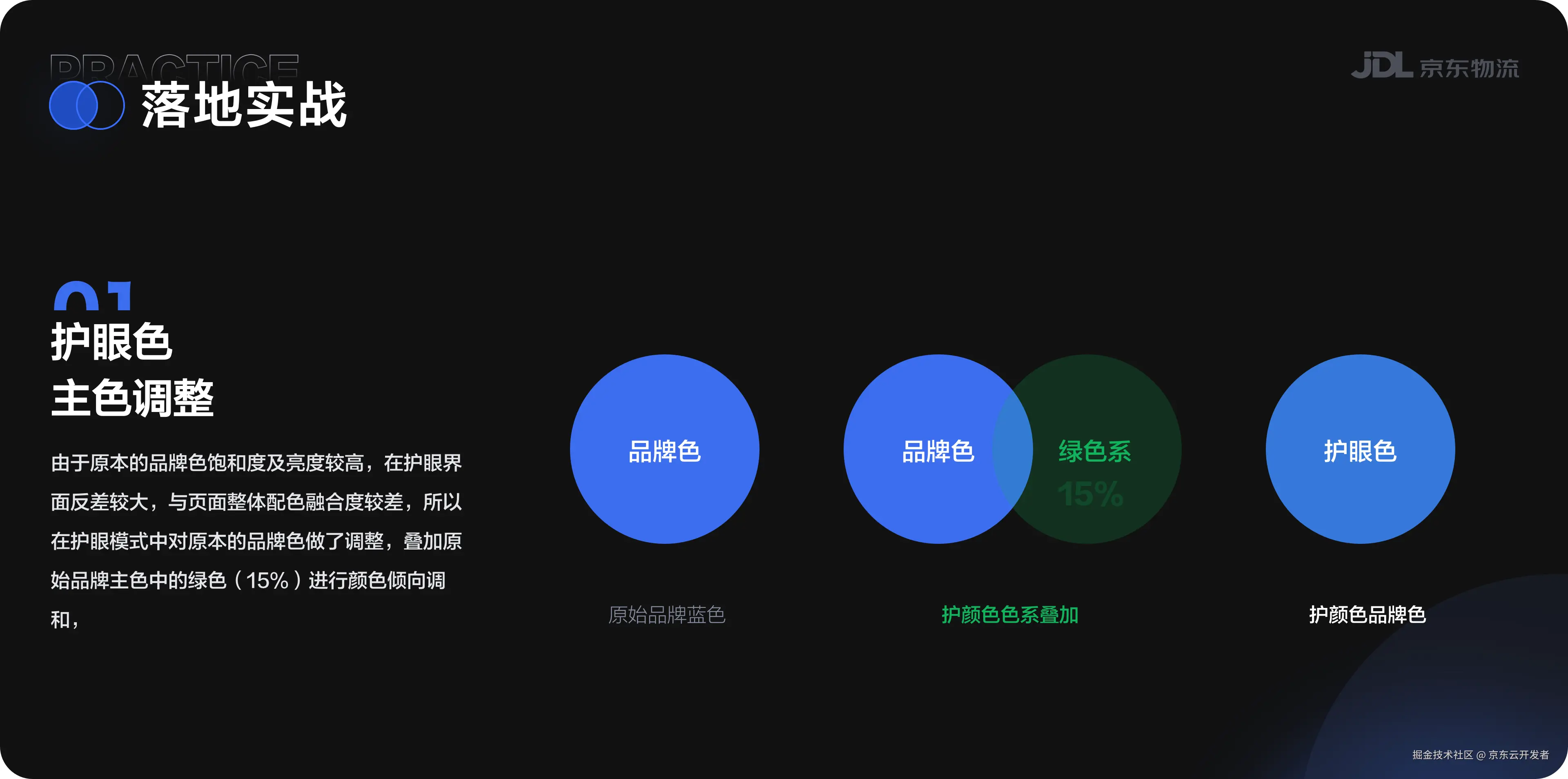 由于原本的物流品牌色饱和度及亮度较高,在护眼界面反差较大,与页面整体配色融合度较差,所以在护眼模式中对原本的品牌色做了调整,叠加原始品牌主色中的绿色(15%)进行颜色倾向调和。