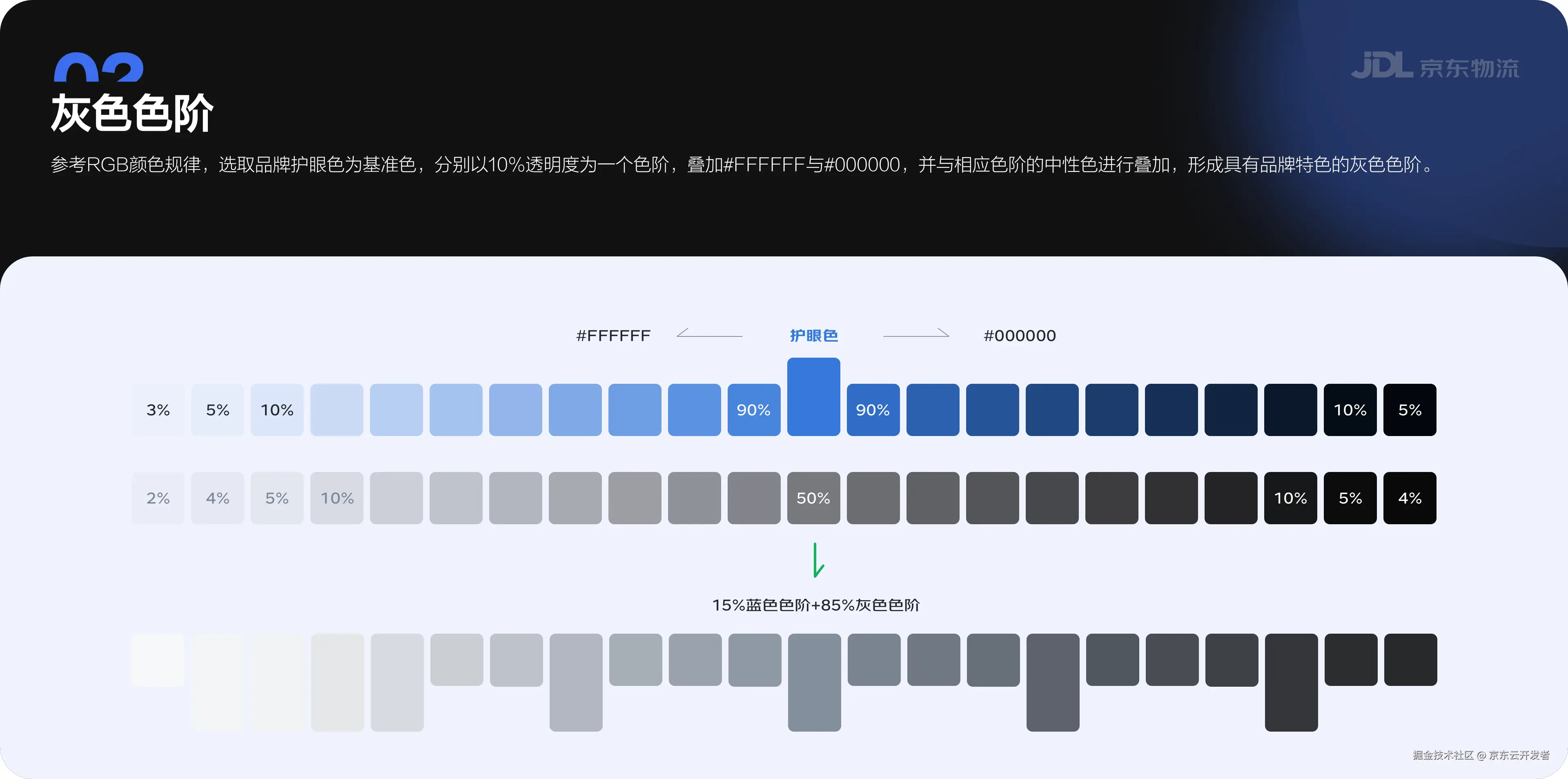 参考RGB颜色规律,选取品牌护眼色为基准色,分别以10%透明度为一个色阶,叠加#FFFFFF与#000000,并与相应色阶的中性色进行叠加,形成具有品牌特色的灰色色阶。