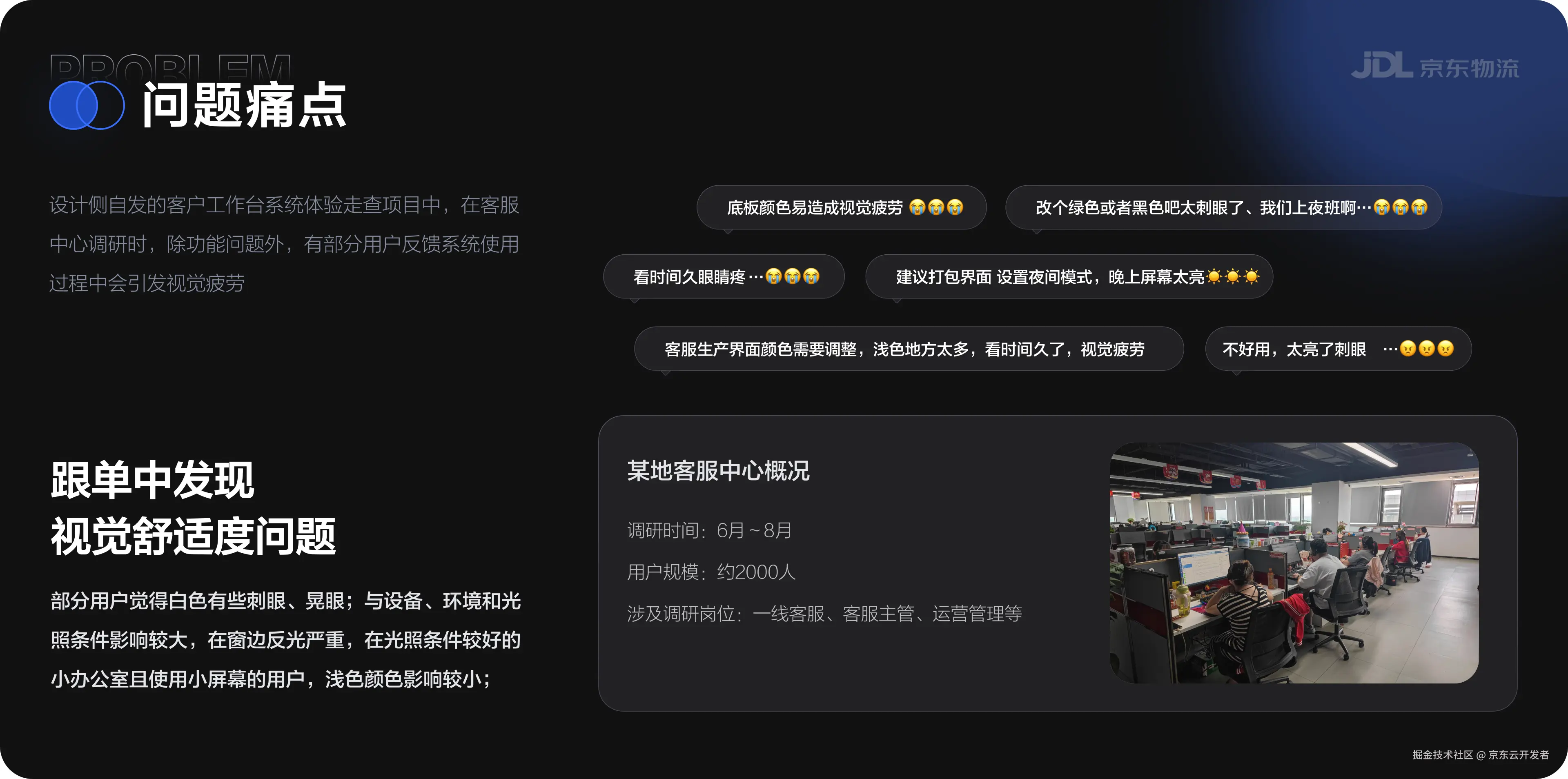 设计侧发起的客户工作台系统体验走查项目中,在客服中心跟单调研时发现,除系统功能问题外,有部分用户反馈系统使用过程中会引发视觉疲劳。