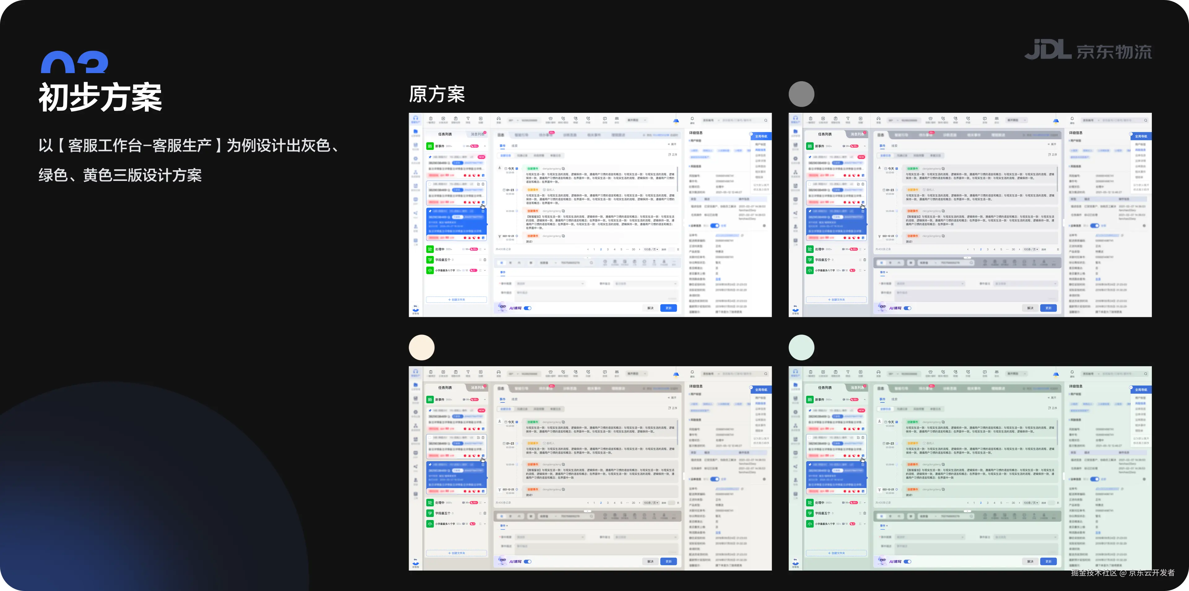 基于以上结论,以客服工作台-客服生产为例设计出灰色、绿色、黄色三版设计方案。