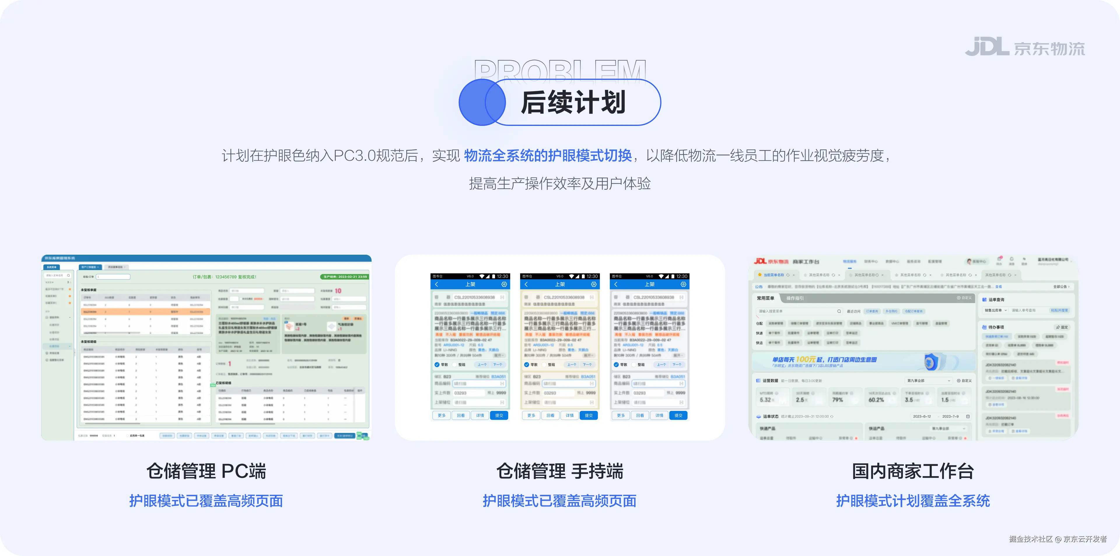目前除客服工作台,越来越多的系统有用户护眼的需求呼声,计划将护眼色纳入PC3.0规范后,可以实现物流全系统的护眼模式切换,以降低物流一线员工的作业视觉疲劳度,提高生产操作效率及用户体验。