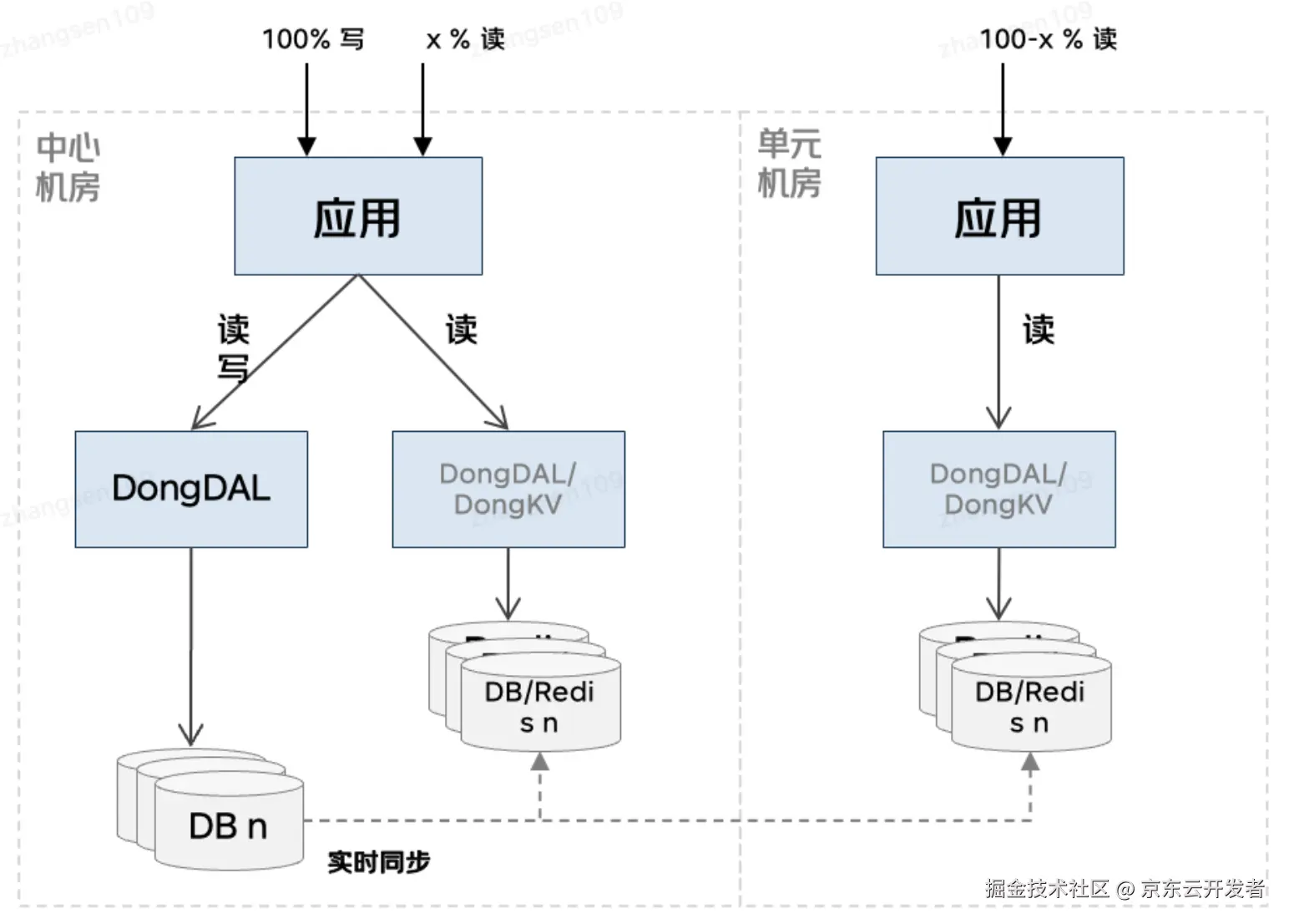 京东数据中心架构是北京和宿迁多机房多活,如下图所示,京东以用户为维度拆分出多个逻辑单元,将逻辑单元分布到北京和宿迁不同机房中。在各机房内流量完全收敛以避免网络延迟,机房间按逻辑单元切流,随着机房间的切流,一个逻辑单元可能落在北京机房也可能落在宿迁机房。