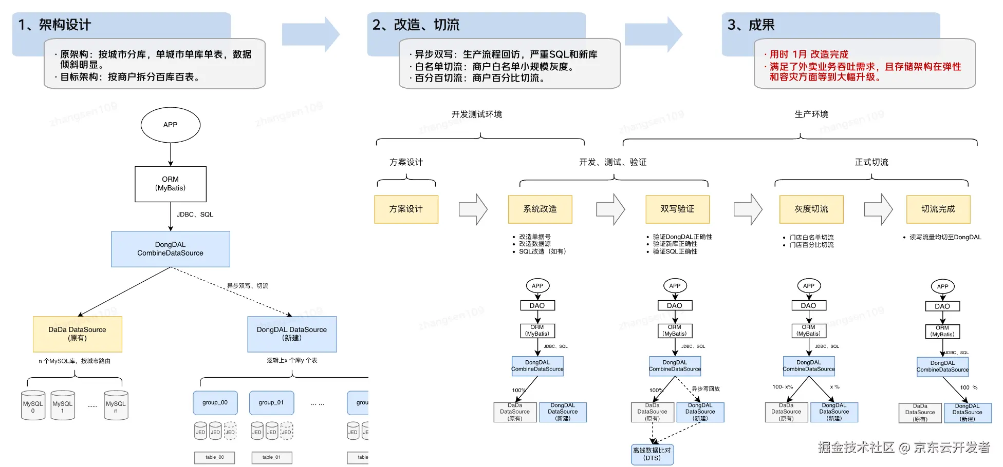 1、统一流水单据号生成规则:每一笔单据数据均有一个唯一ID,即单据号。如下图"第一步"所示,改造流水数据单据号的生成规则,在流水数据的单据号中,拼接入数据库路由信息,该路由信息明确该笔单据所存储的目标库。