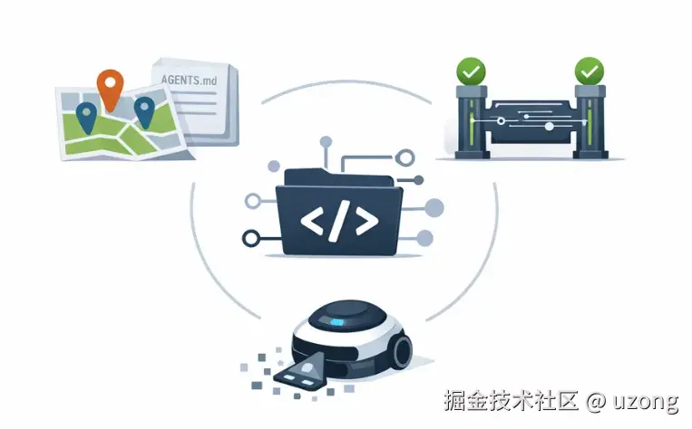AGENTS.md文件。根目录的文件定义全局默认规则,子目录的文件则覆盖本地规则 - 渐进式披露:AI 从根目录的入口文件开始,按需深入到具体子目录获取局部上下文,而不是一次性灌入海量信息。
