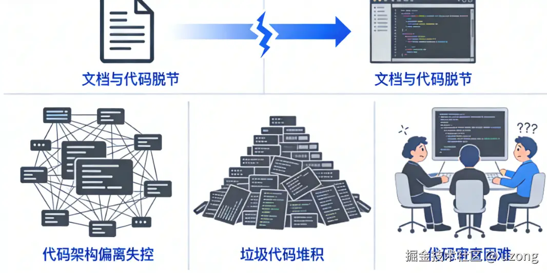 - 文档与代码脱节,上下文跟不上或冗余,导致理解偏差,代码质量越来越差;甚至之前明确告知的禁忌,在后续沟通中仍被遗忘。
