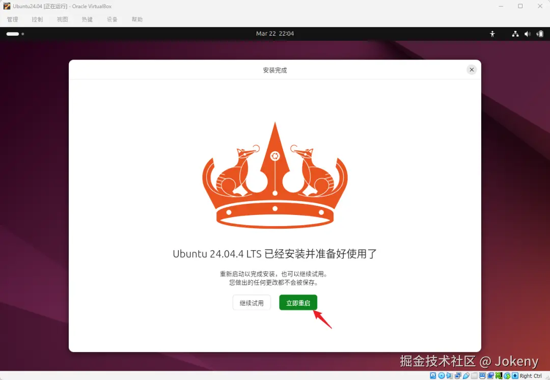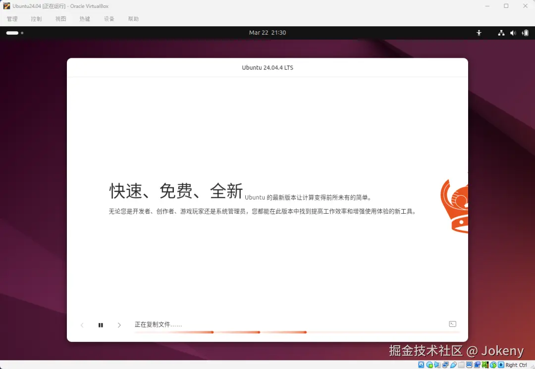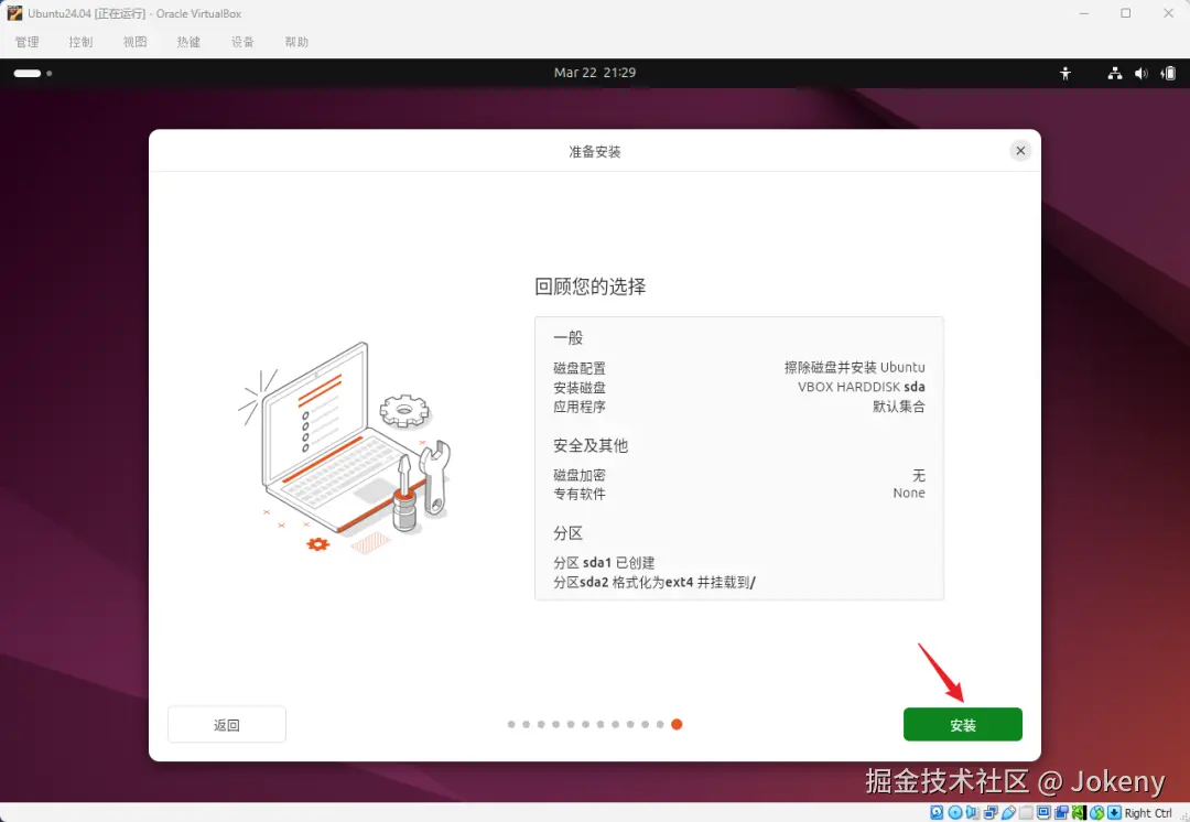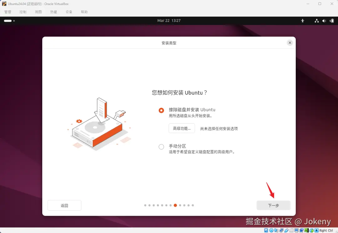 - 安装类型选"擦除磁盘并安装Ubuntu"(别怕,擦的是虚拟硬盘,不是你真硬盘)