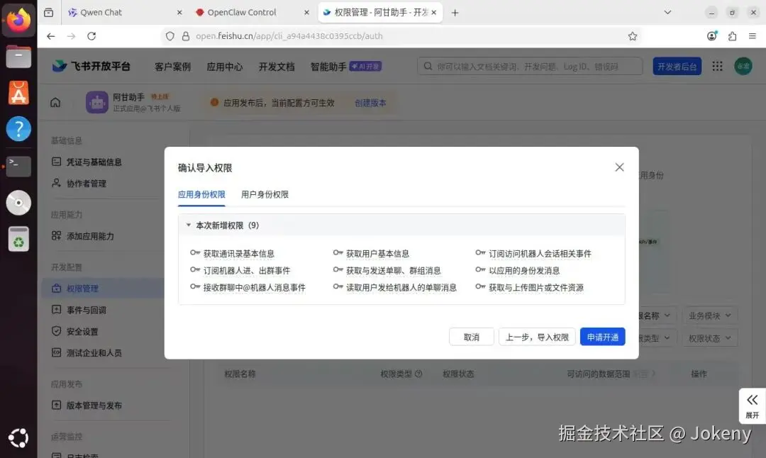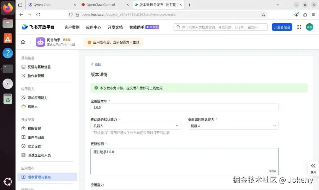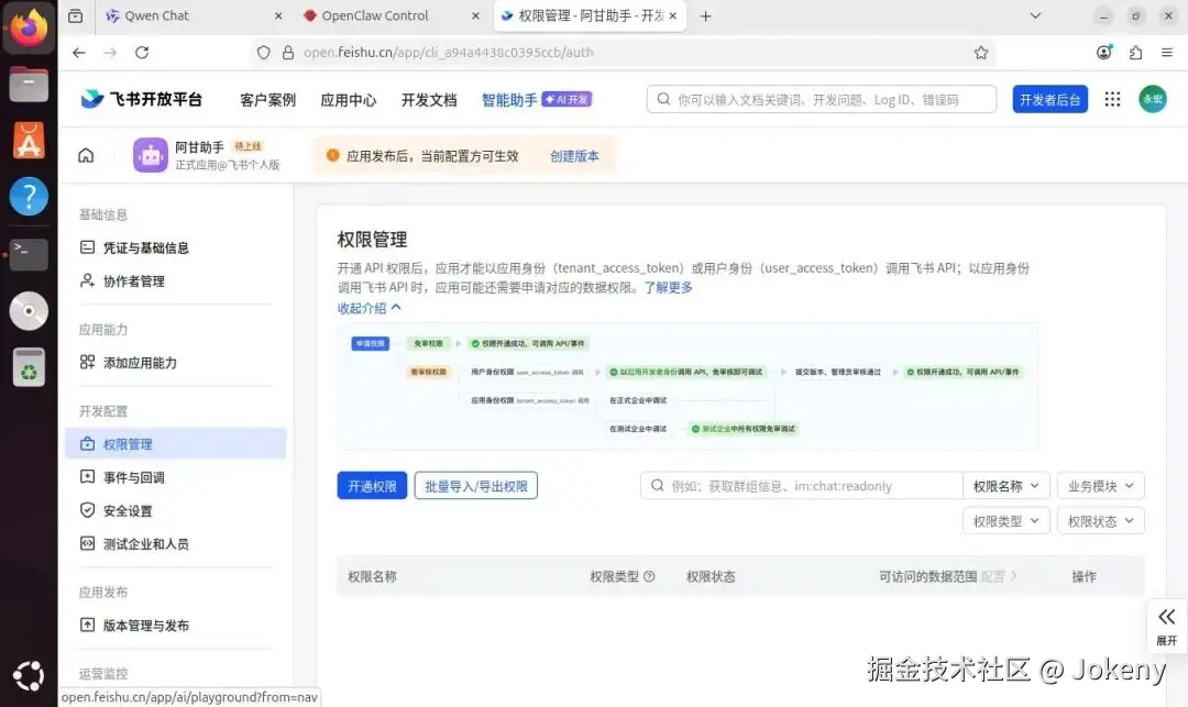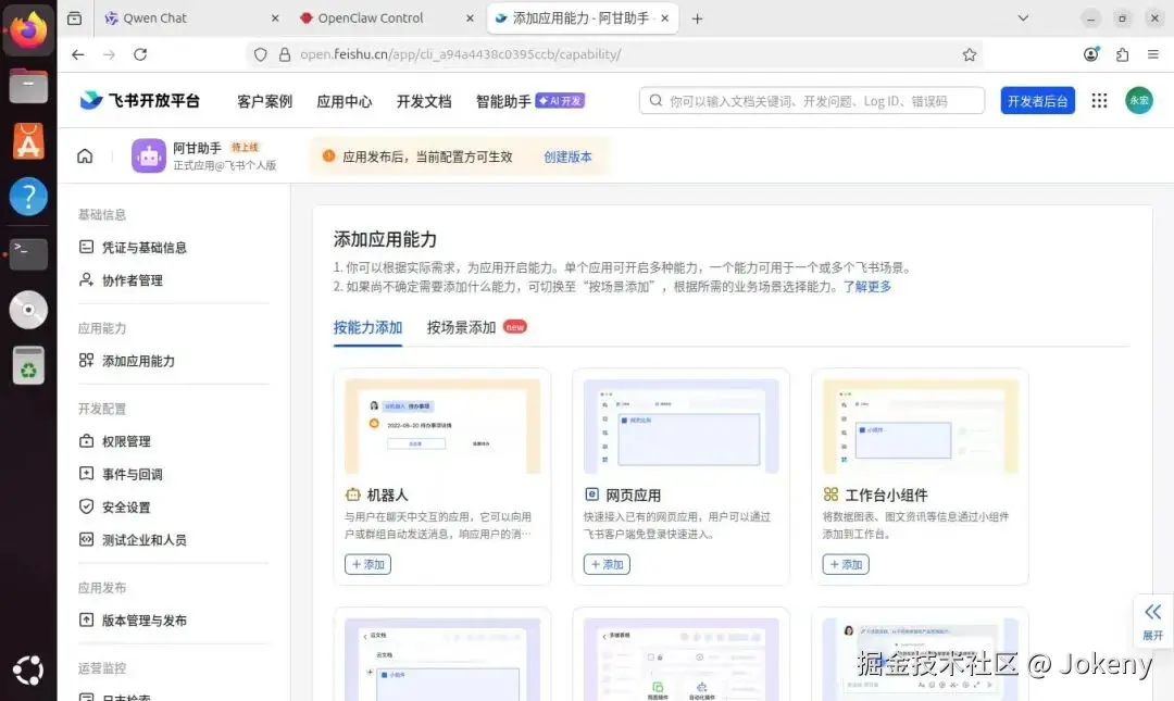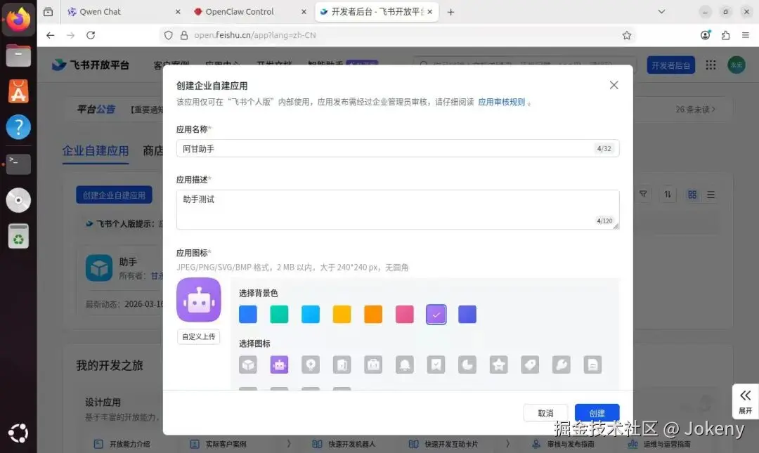 填写应用名称(比如"AI助手"),应用描述随便写,点击"创建"按钮后进入应用详情页