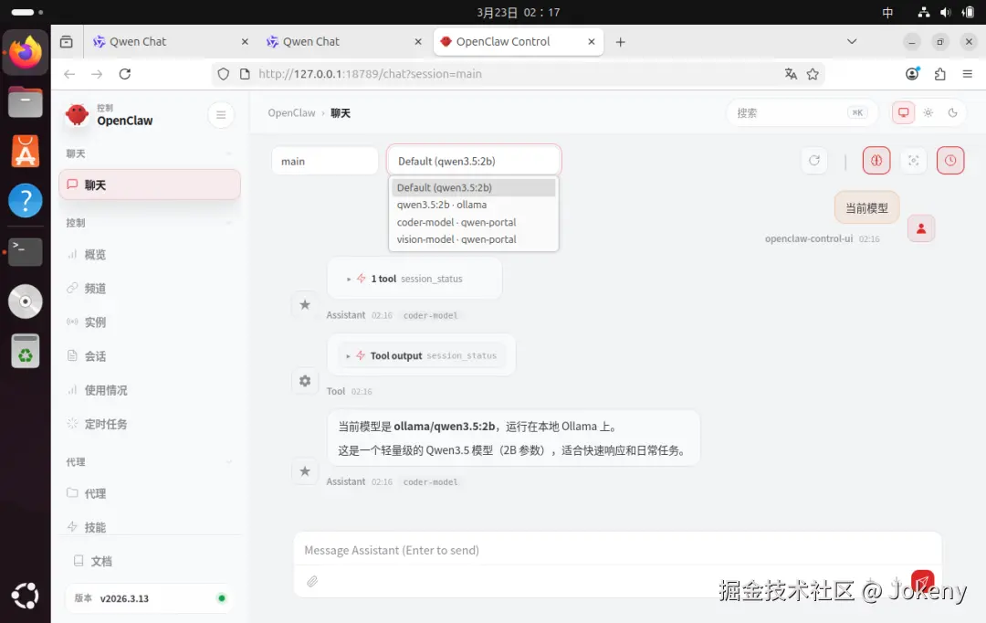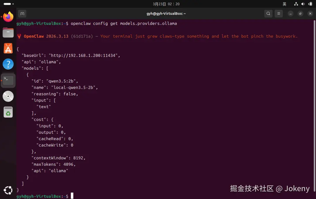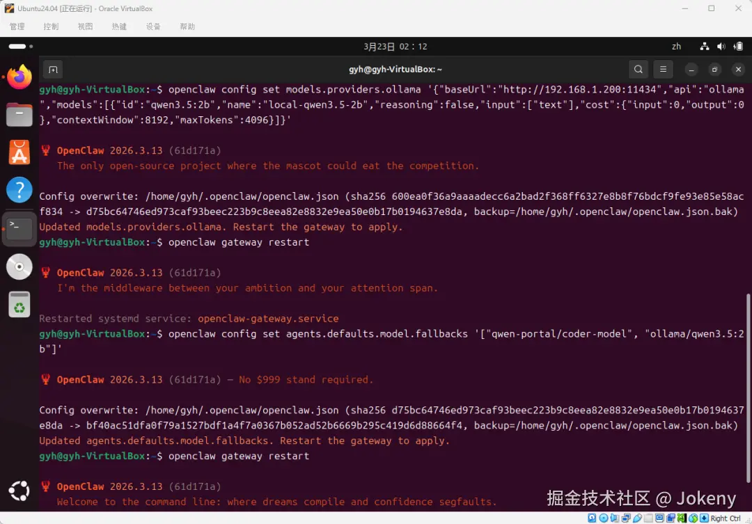 这就是这套方案的核心:OpenClaw跑在虚拟机里,大模型用Ollama本地运行,对话内容完全不离开硬盘。如果需要更强的模型能力,也可以灵活接入云端API,但这时候数据流向是明确的------你自己做主。