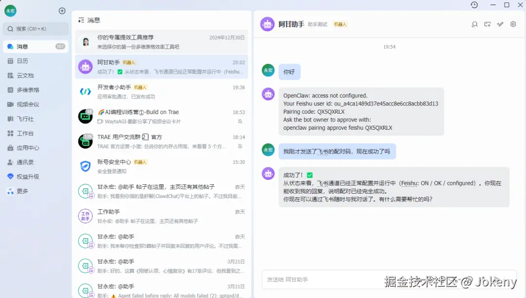 至此,飞书和龙虾配置成功,可以愉快的帮你打工了。
