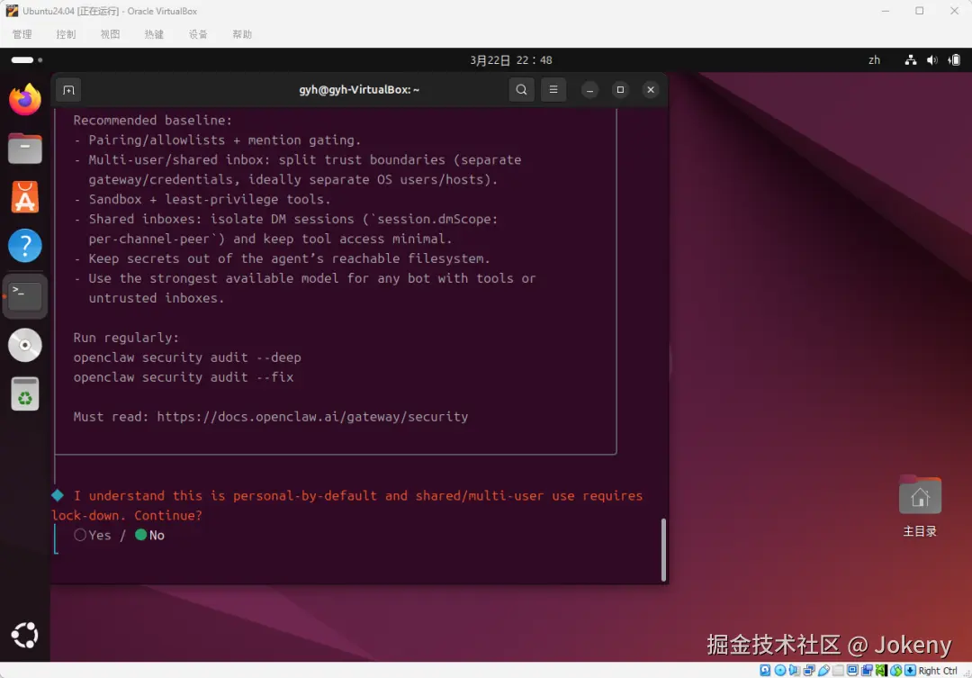 "我理解这个默认是个人使用的,如果要用在多用户/共享环境,需要进行安全加固。继续吗?"