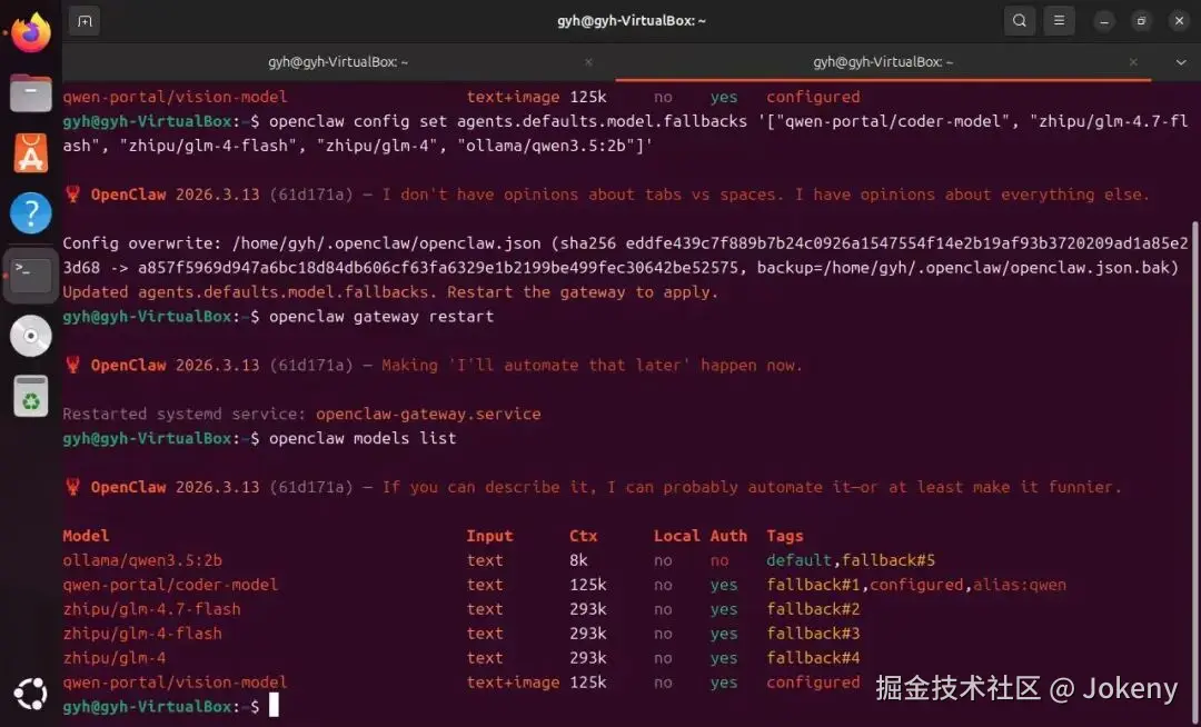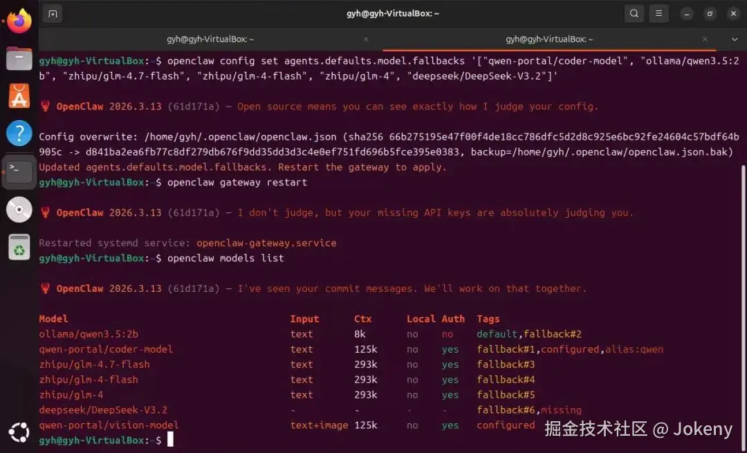 openclaw config set agents.defaults.model.fallbacks '["qwen-portal/coder-model", "ollama/qwen3.5:2b", "zhipu/glm-4.7-flash", "zhipu/glm-4-flash", "zhipu/glm-4", "siliconflow/deepseek-ai/DeepSeek-V3.2", "minimax/MiniMax-M2.5"]'