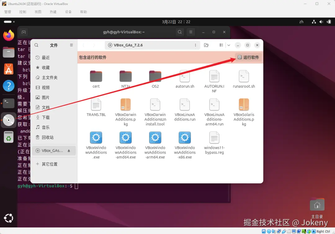 第三步 :点击 设备 → 安装增强功能。这时候桌面侧边栏会多出一个光盘图标,点开它,点右上角的"运行软件"按钮。