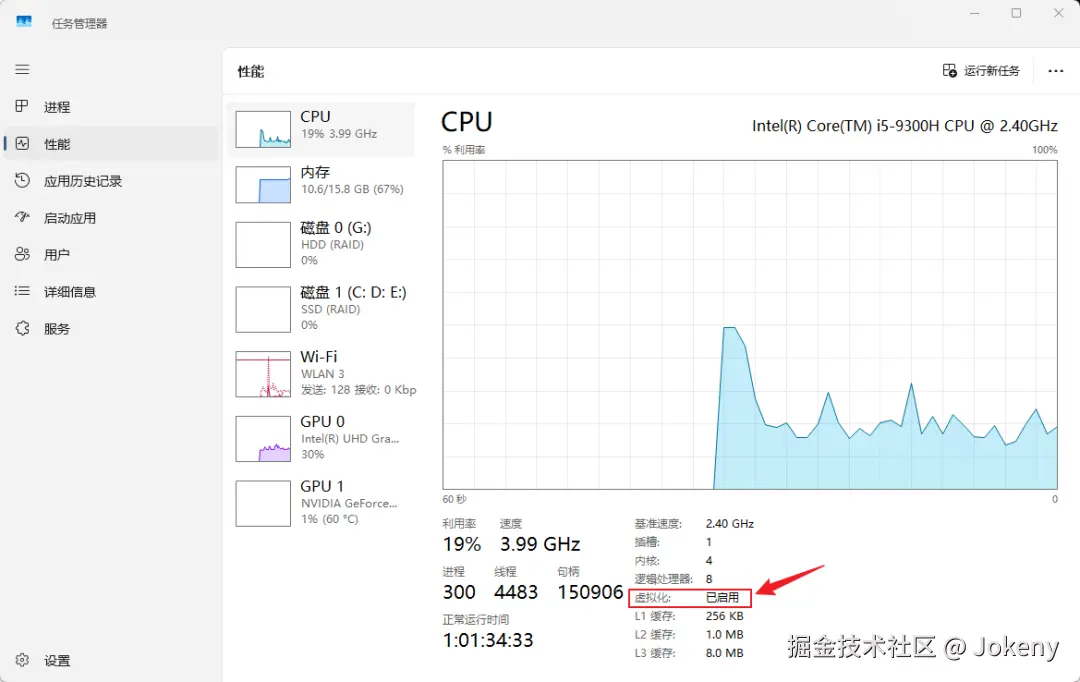 右键任务栏 → 任务管理器 → 性能 → CPU,看右下角有没有"虚拟化"字样。