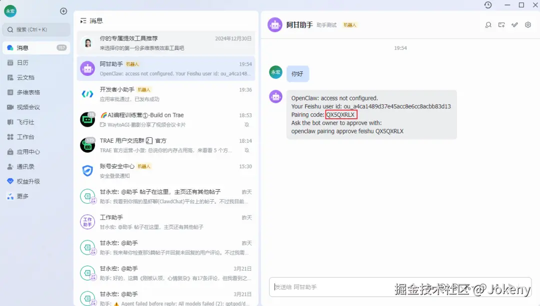 点击飞书中的"开发者小助手" → "打开应用",随便给我们的机器人发送一条消息,获取一下配对码,如下图: