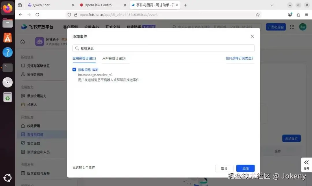 点击【添加事件】,搜索"接收消息",将"接收消息"添加进来。