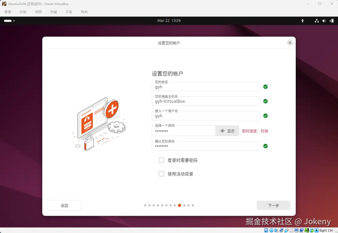 - 用户名和密码一定记牢,后面每一步都要用,取消登录时需要密码。然后点下一步、下一步,然后开始安装,这里安装需要耐心等待一段时间。