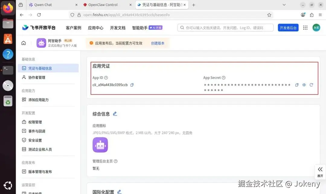 复制飞书中的"APP ID"和"APP Secret",执行下面的命令:
