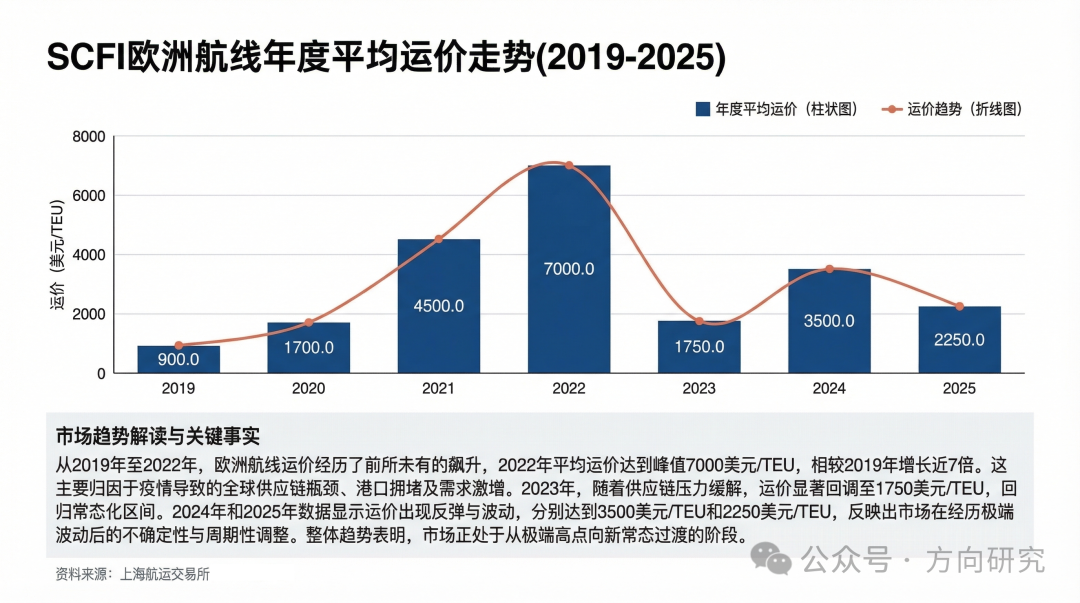 2021 年是全球集装箱航运市场的 "史诗级波动年":受新冠疫情导致的供应链中断、苏伊士运河堵塞等黑天鹅事件叠加影响,上海出口集装箱运价指数(SCFI)欧洲航线从 2020 年初的约 1000 点,在短短 18 个月内飙升至 2021 年 10 月的 5472.62 点,同比涨幅超过 447%------ 相当于一个 40 英尺高箱的运费从不足 1500 美元暴涨至超 1.2 万美元,远超 2008 年金融危机时期的峰值。