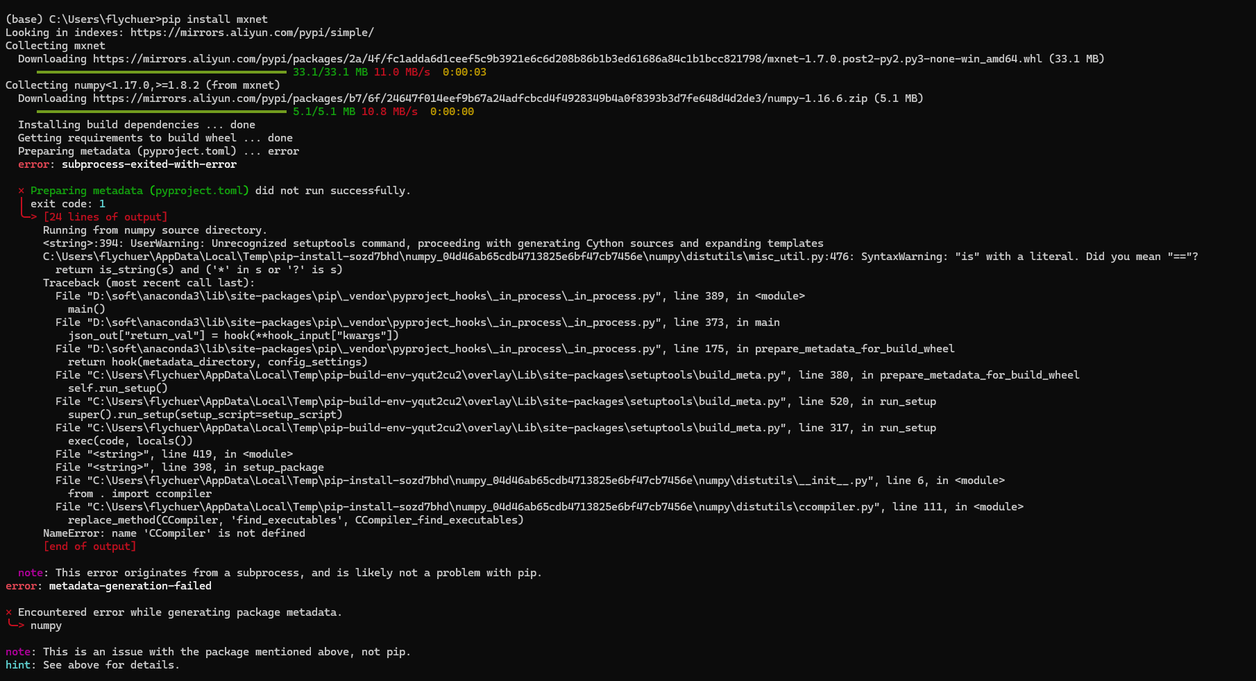 note: This error originates from a subprocess, and is likely not a problem with pip.