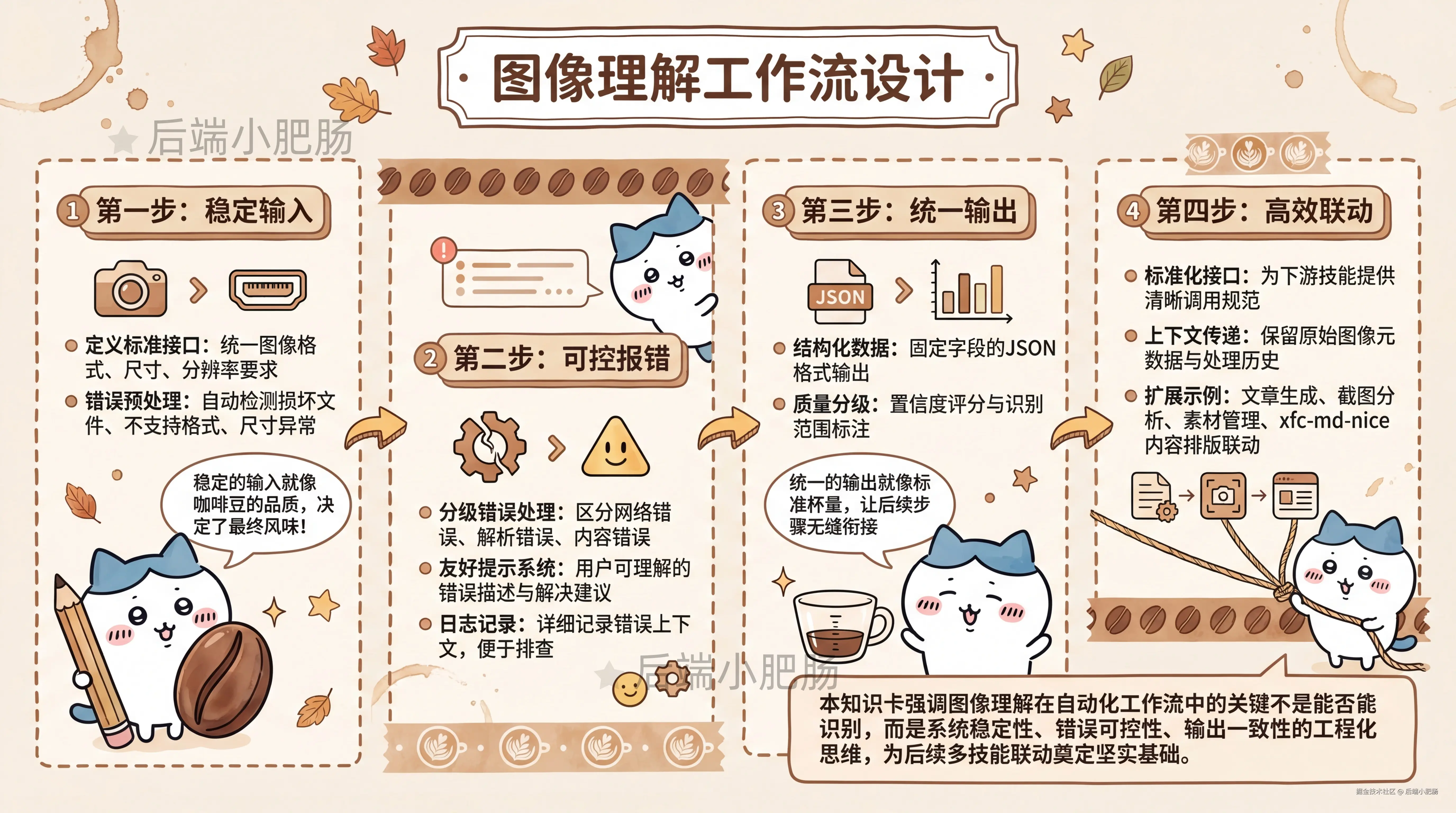 所以我在设计这个 skill 时,关注的重点并不是"它能不能识图",而是:输入是不是稳定、报错是不是可控、输出是不是统一,以及后续别的 skill 能不能直接 使用它的输出 。