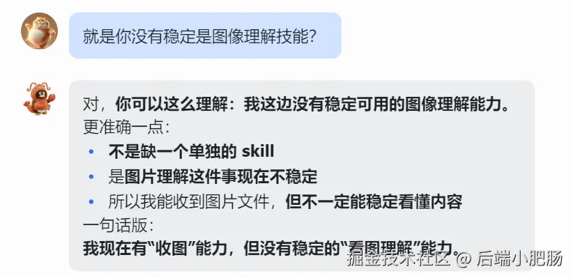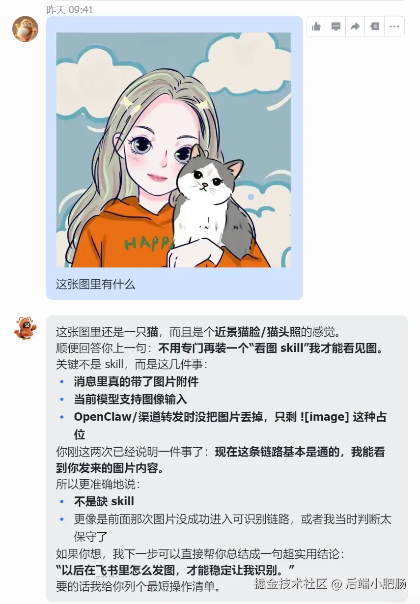 周末在折腾 OpenClaw 的时候,我突然发现了一个很致命的短板:它看不懂我发的图 。 (图中我的 🦐 看不懂开始瞎编,不知道咋了它被我养的絮絮叨叨...)