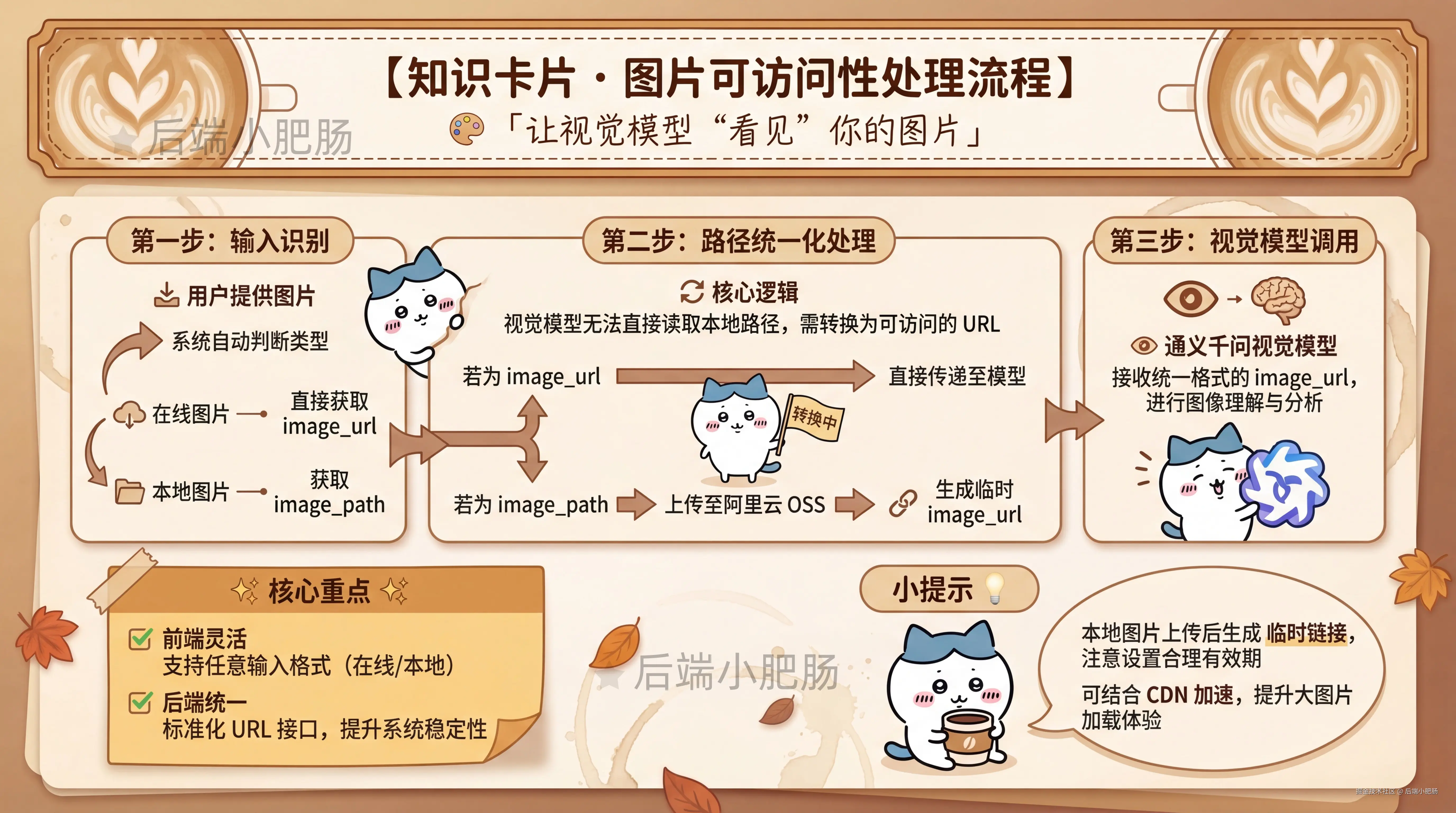 因为视觉模型并不直接认识你电脑里的本地路径,所以只要用户给的是本地图片,就必须先处理成模型能访问的 URL。