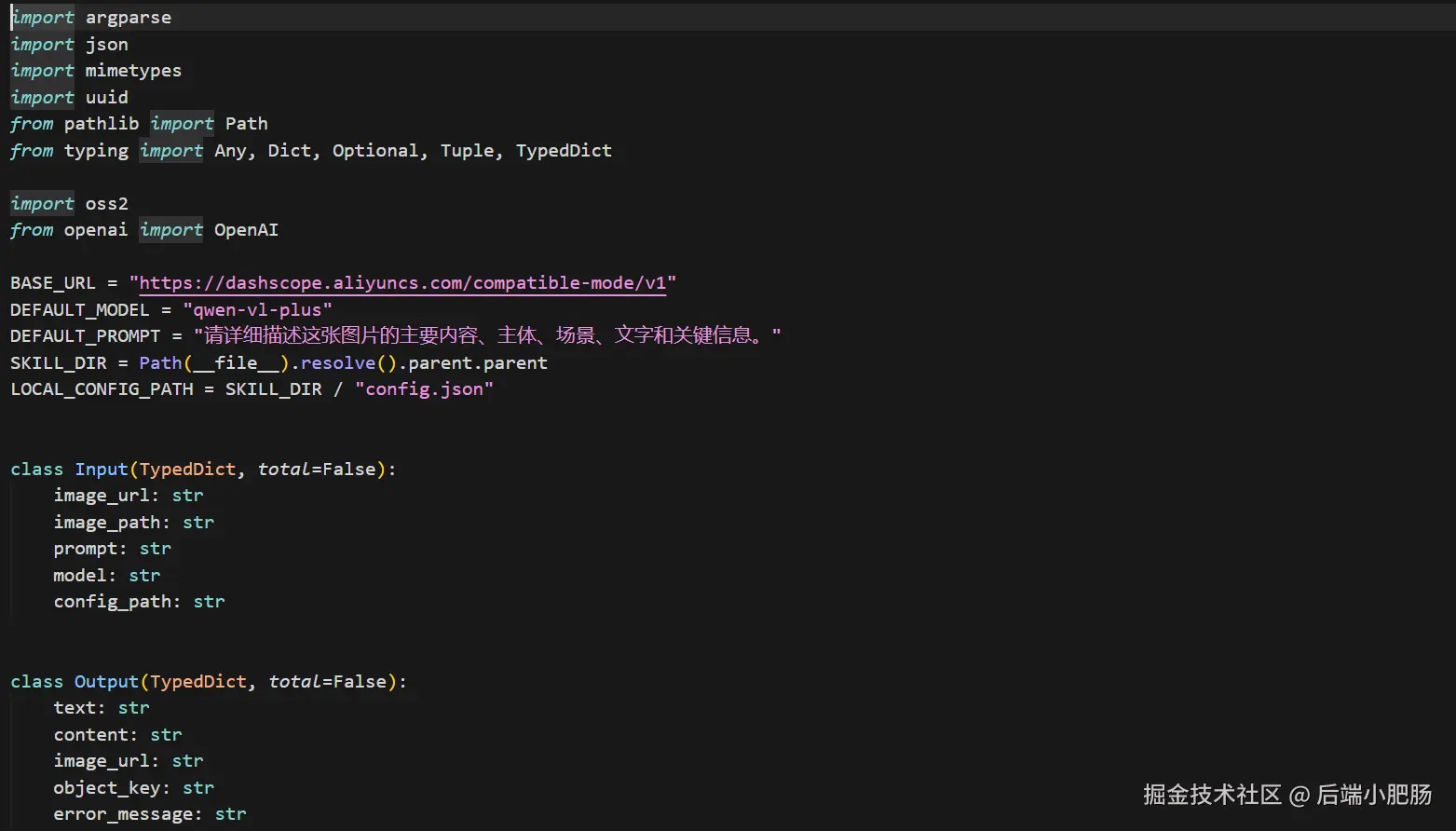 在整条链路里,我们既要调用阿里云视觉模型,又要让脚本有权限把本地图片传到 OSS。 所以一定要有一个统一管理配置的文件:config.json。