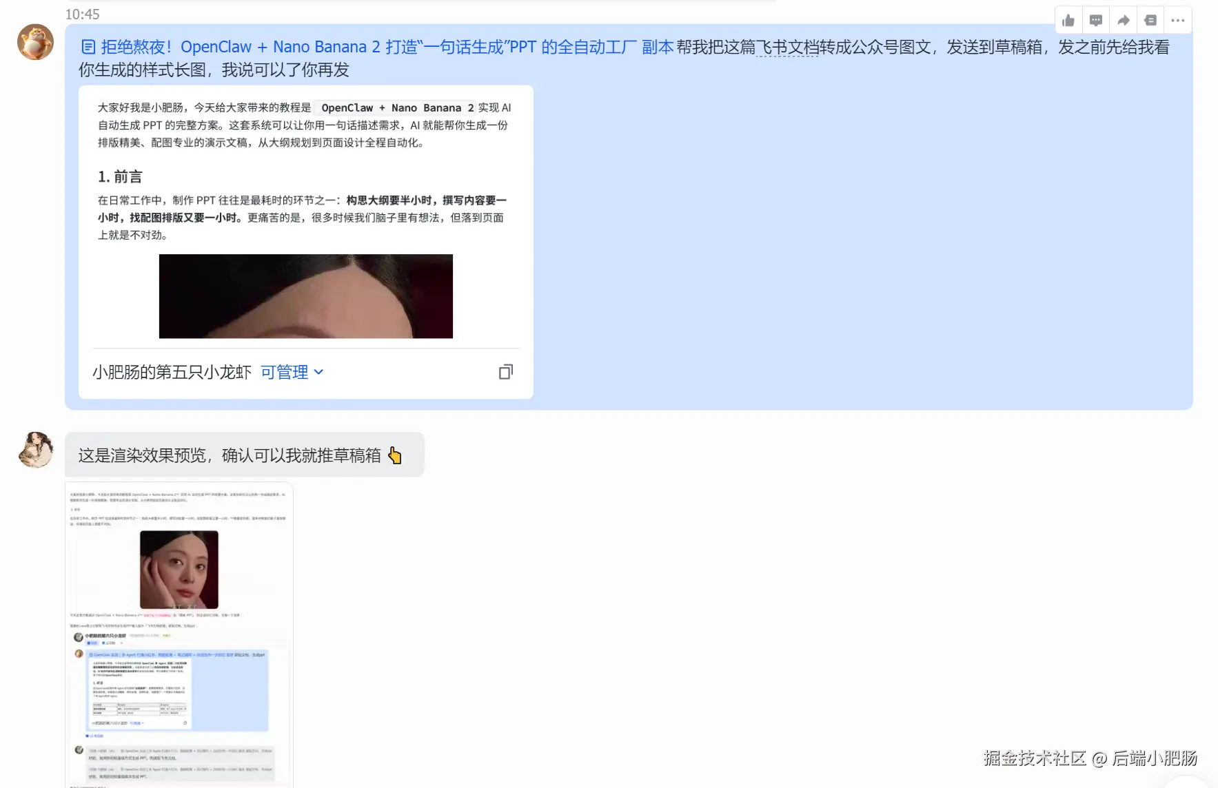 我现在只要发一句命令: [飞书文档链接] 帮我把这篇飞书文档转成公众号图文,发送到草稿箱,发之前先给我看你生成的样式长图,我说可以了你再发