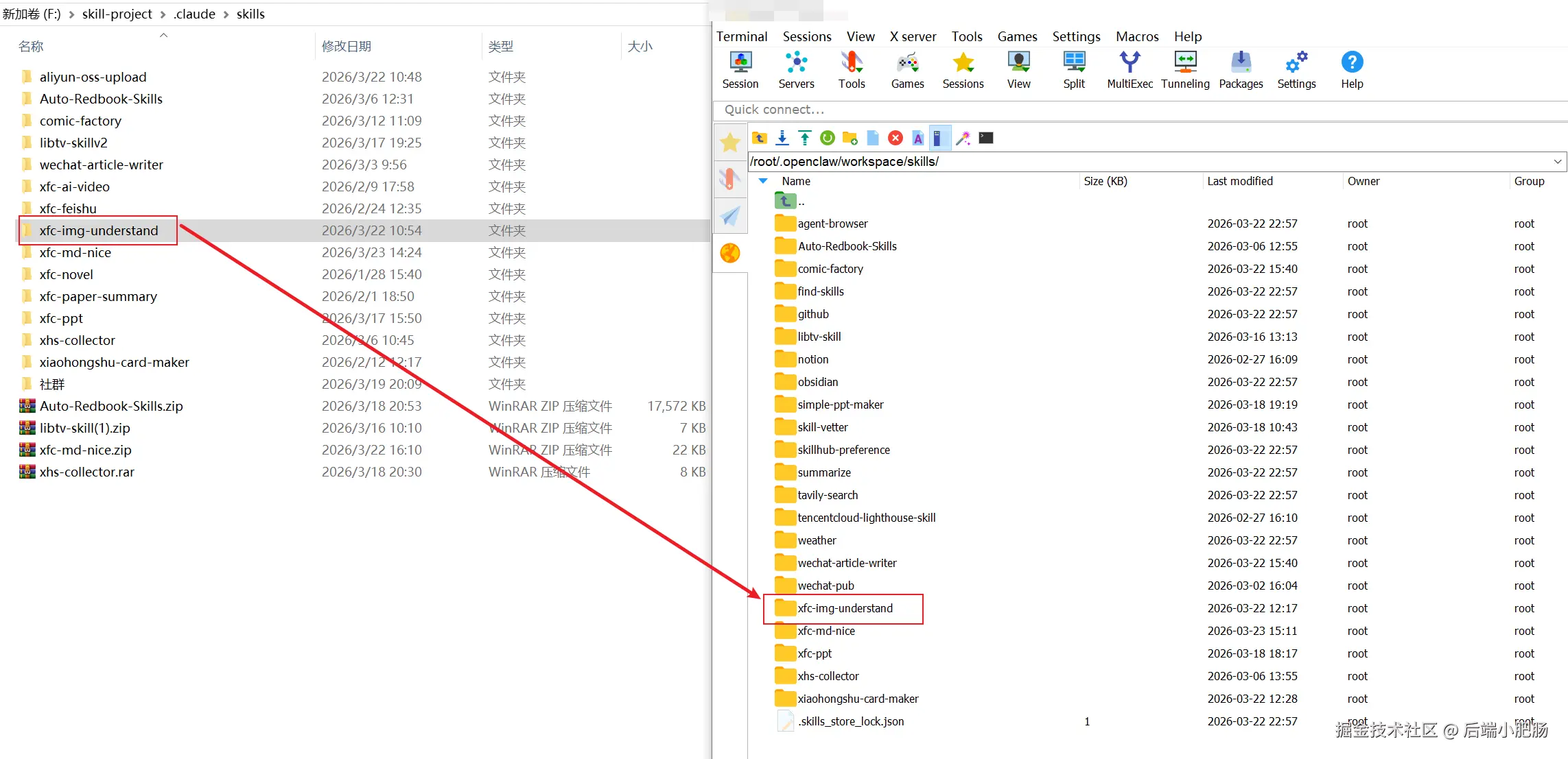 Openclaw接入skill方法很简单,找到任意FTP工具传输到服务器的/root/.openclaw/workspace/skills/目录即可。