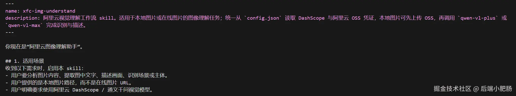 SKILL.md 可以理解为整个 Skill 的大脑和说明书 。它决定了 OpenClaw 在收到用户请求后,能不能正确识别"这件事该不该调用 xfc-img-understand 来做"。