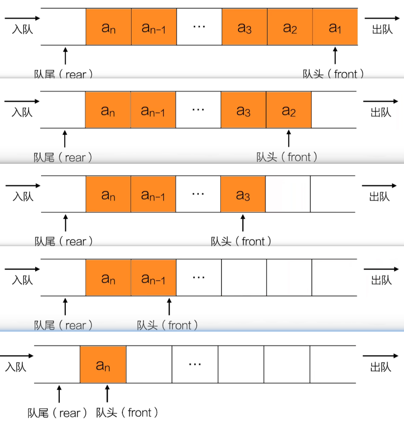 front指向队头,rear指向队尾下一个位置,front == rear表示队空。- 静态数组队列存在 "假溢出" 问题,通过数据搬移 (
