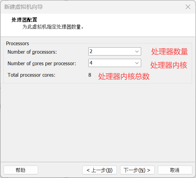 - 这里设置处理器,一般建议8核,也就是2个处理器,4个内核