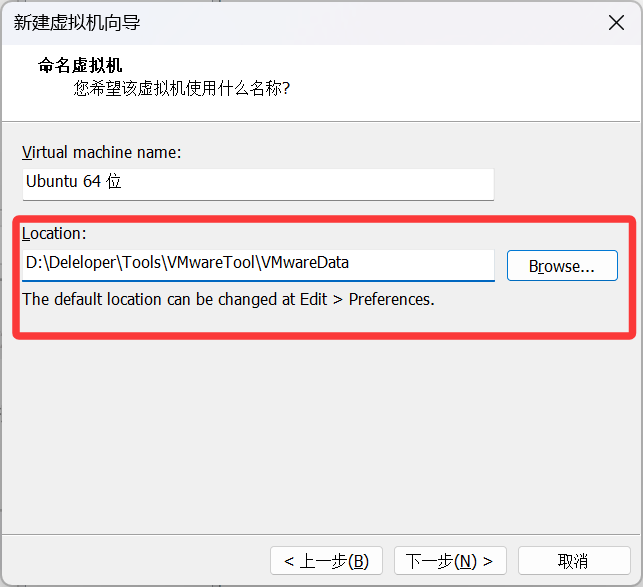 - 定义在VMware中显示的名字和虚拟机文件目录,一般选择在比较大的硬盘里(上述在安装时定义了VMwareData,专门存放虚拟机)