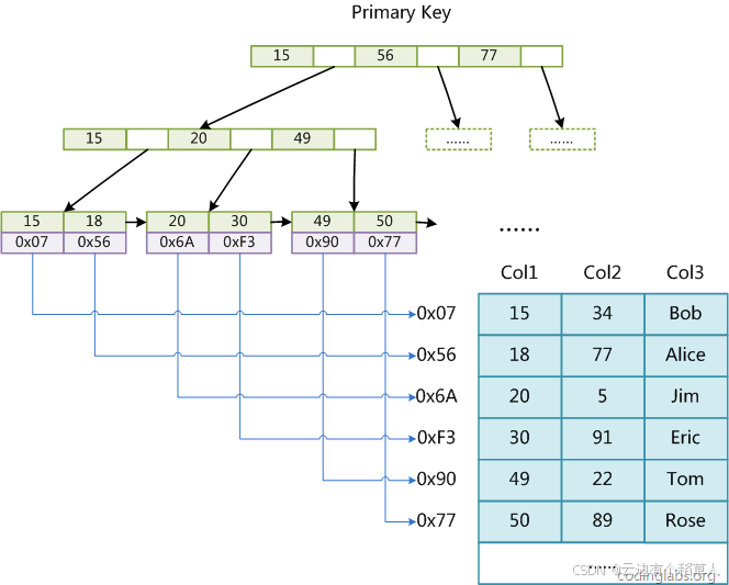 MyISAM 引擎同样使用B+树作为索引结果,叶节点的data域存放的是数据记录的地址。下图为 MyISAM 表的主索引, Col1 为主键。
