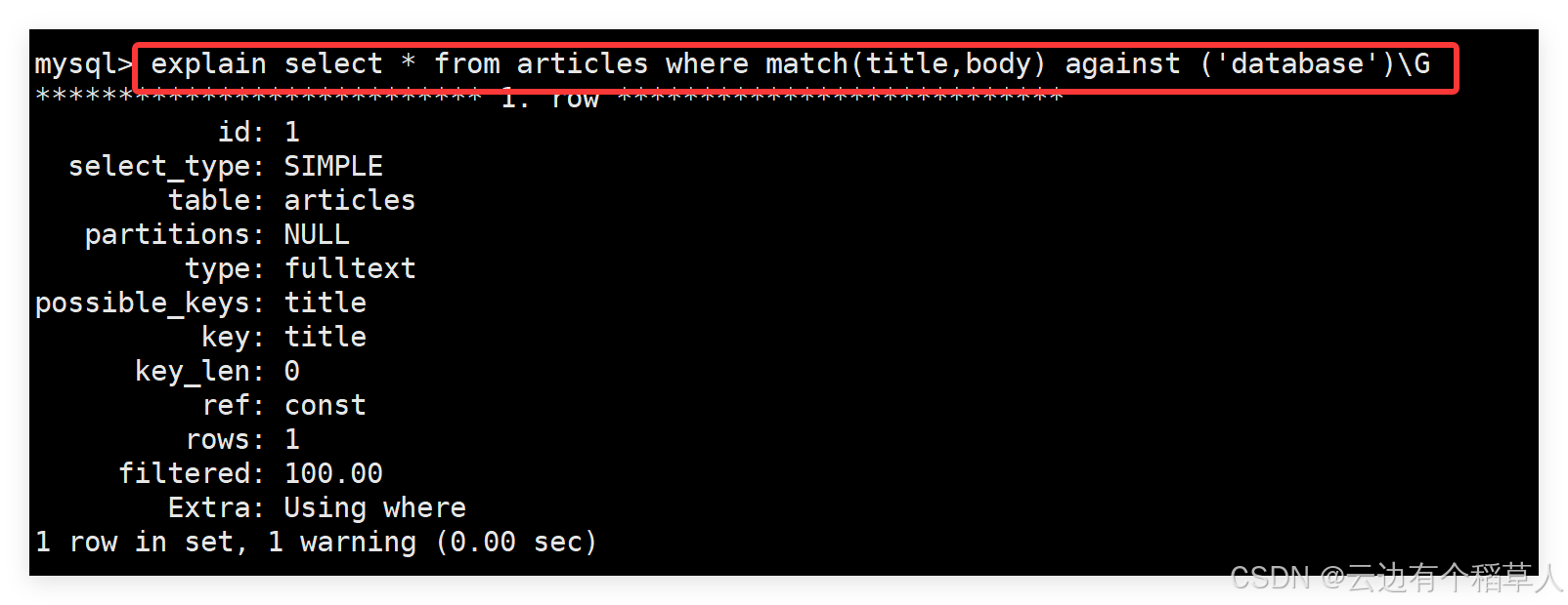如果使用如下查询方式,虽然查询出数据,但是没有使用到全文索引