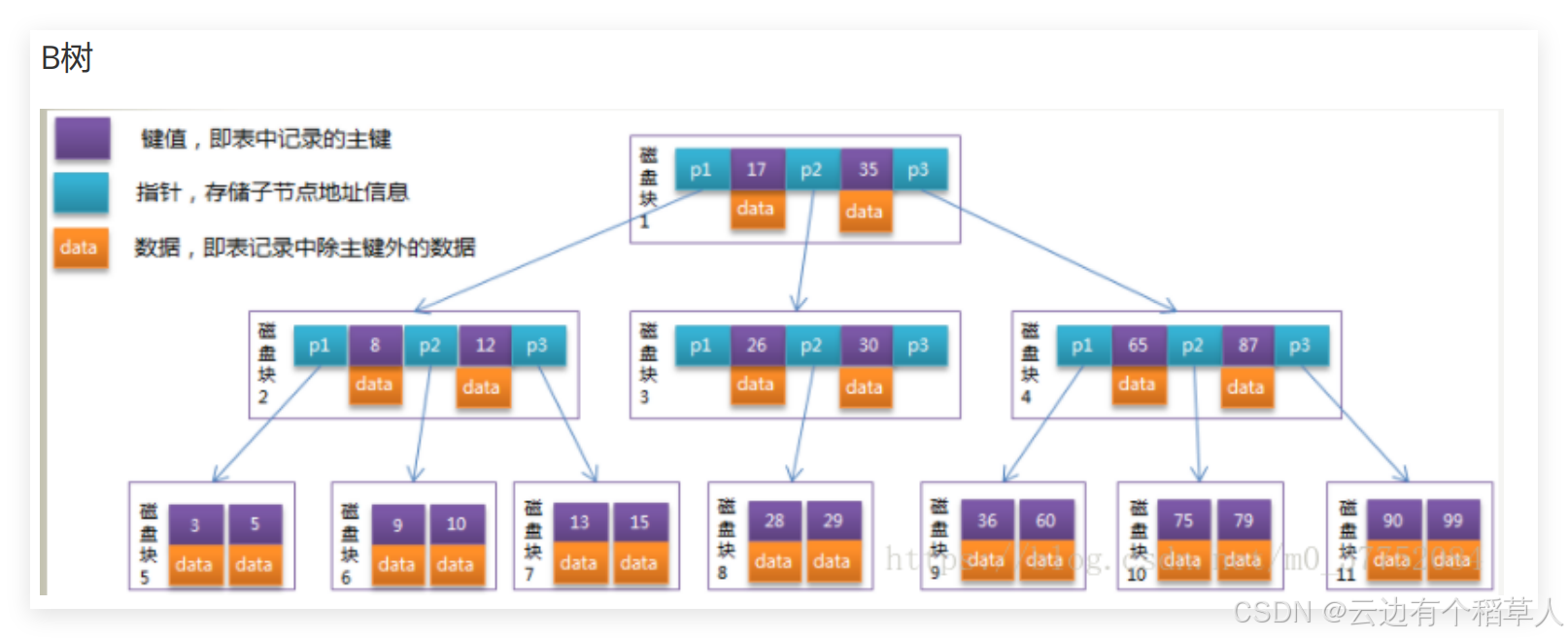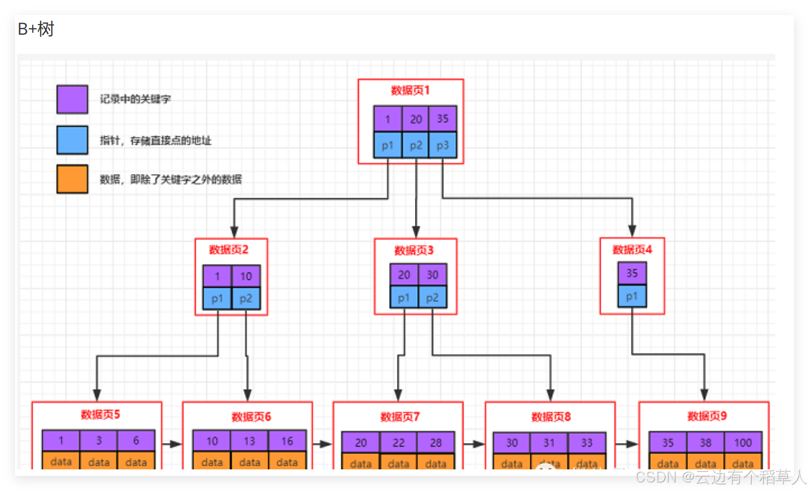 - B树节点,既有数据,又有Page指针,而B+,只有叶子节点有数据,其他目录页,只有键值和 Page指针