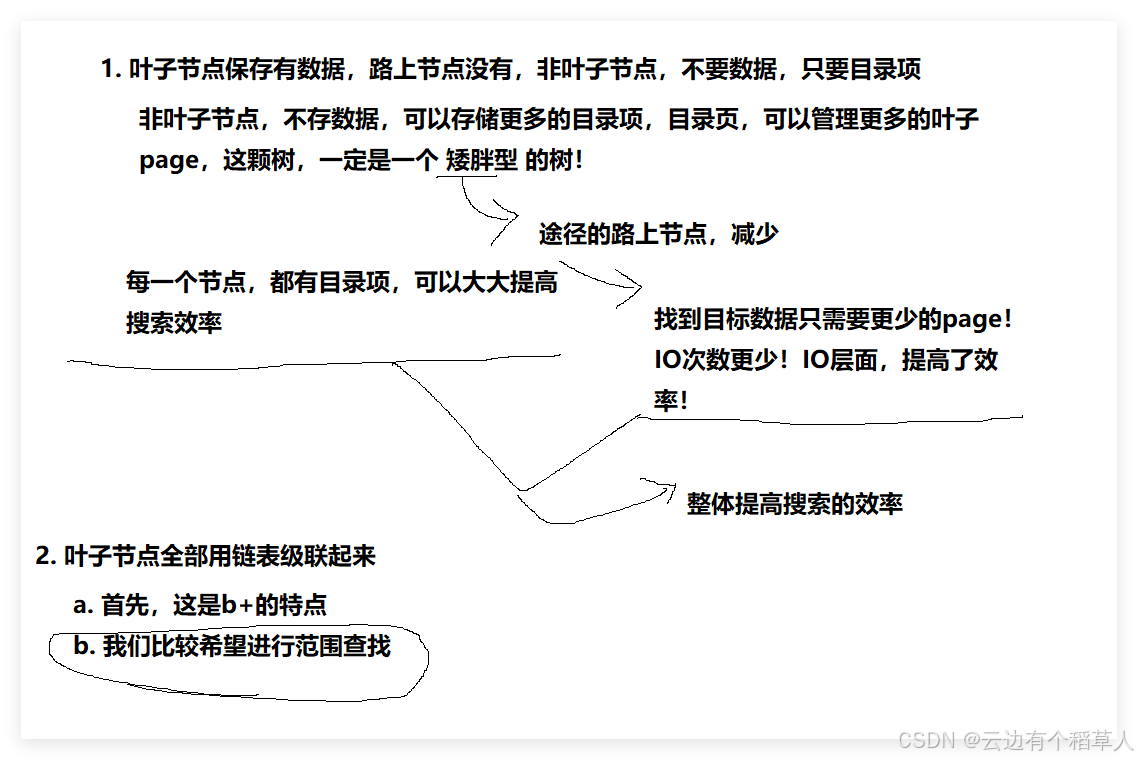 现在查找的Page数一定减少了,也就意味着IO次数减少了,那么效率也就提高了。只有叶子结点才会用指针级联起来。