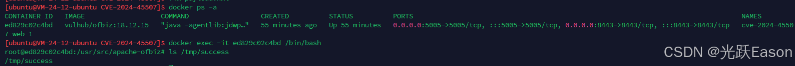 touch /tmp/success:Linux系统命令,意思是"在/tmp目录下创建一个名为success的空文件",我们用这个简单命令来验证漏洞是否存在