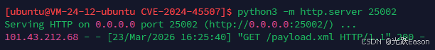 我们创建的payload.xml文件,需要让靶场服务器能访问到,所以要在攻击端启动一个简单的HTTP服务,把这个文件"暴露"出去。