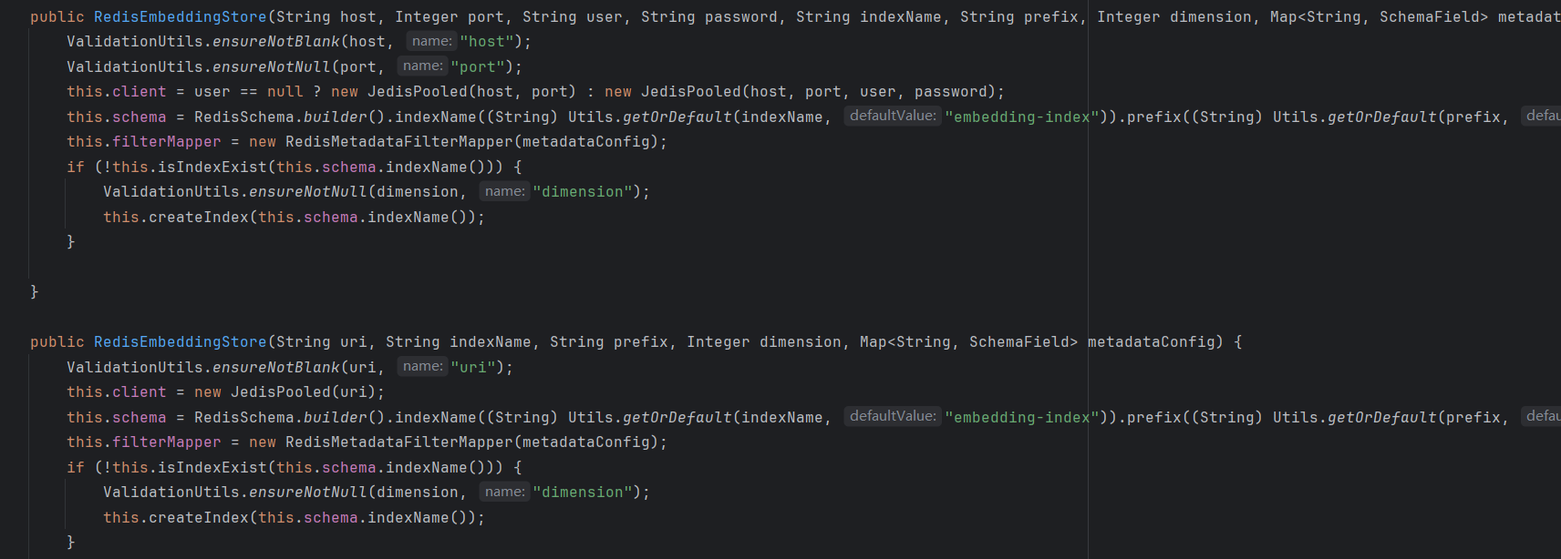 这是langchain4j中RedisEmbeddingStore的两种构造方法
