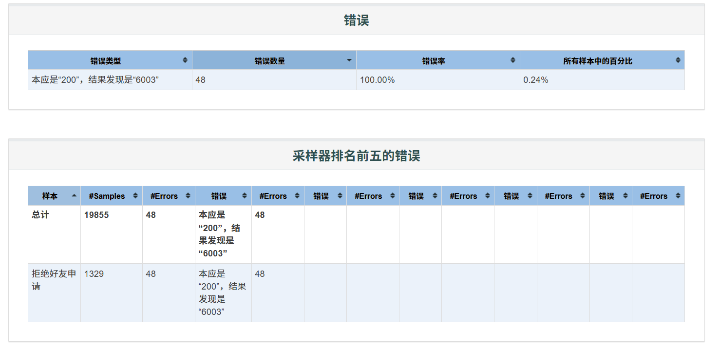 说明:大部分请求是成功的,只有约 0.24% 的请求因断言不通过标记为失败,且主要集中在返回 6003 的场景(删除失败,该聊记录不存在或已被删除)