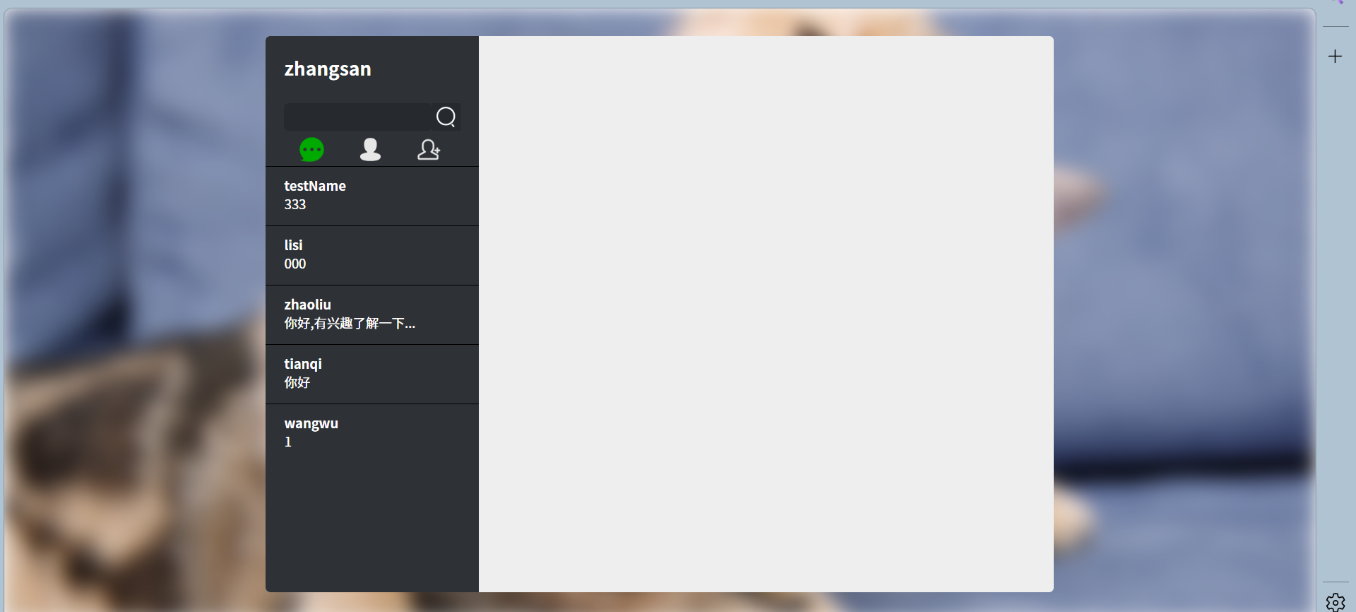 • 注册、登录、好友管理、添加 / 拒绝 / 同意好友、发送消息、会话列表、首页展示