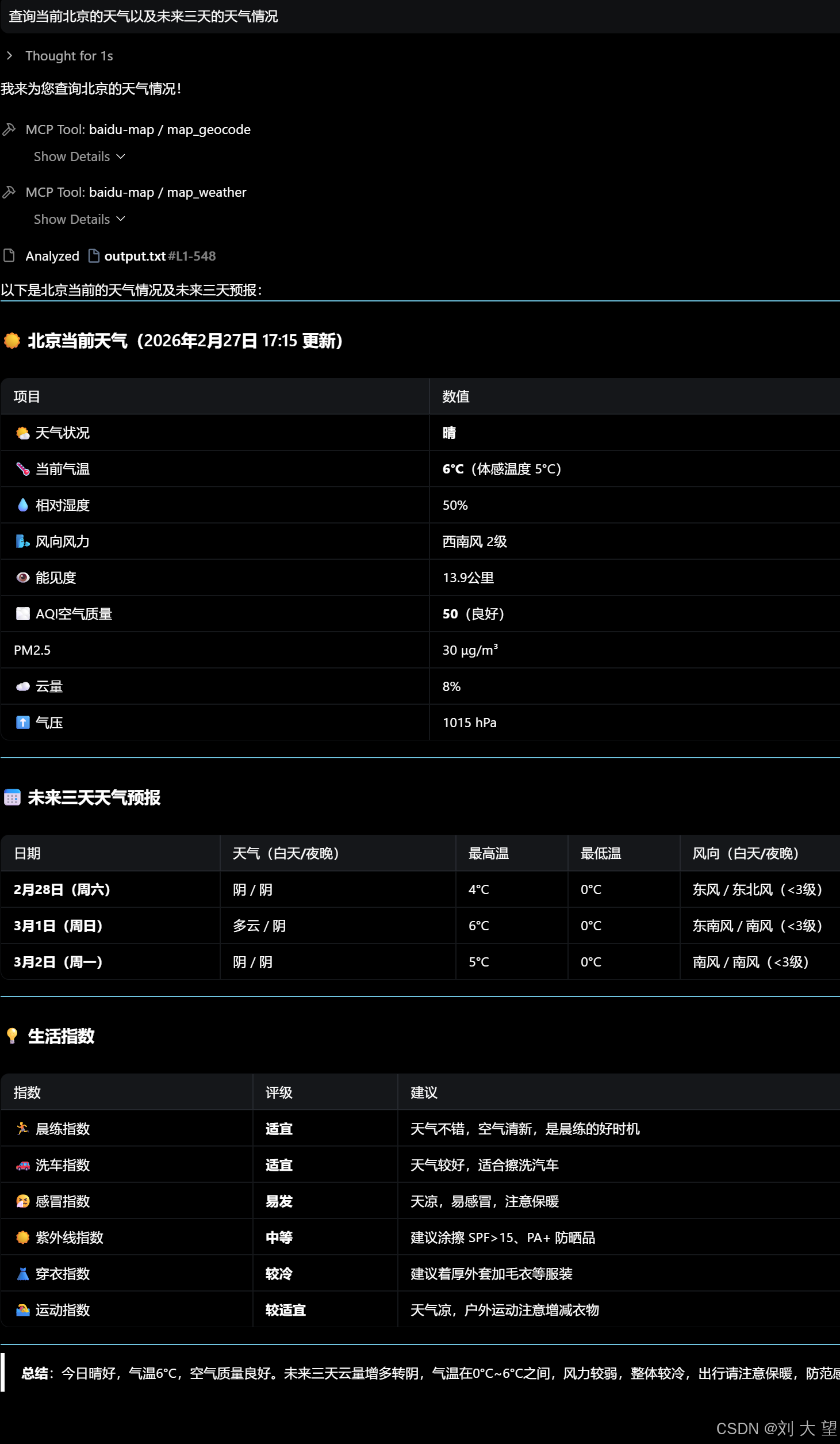 以下浏览器天气搜索出来的 可以看到可以正确调用百度地图的weather tool工具 结果正确