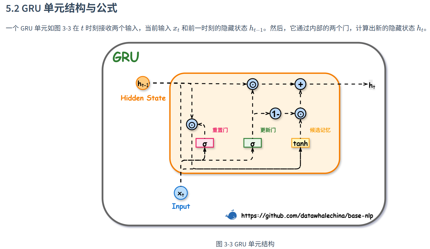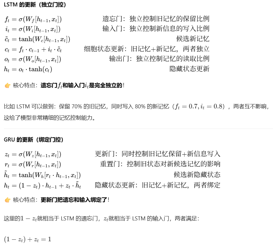 不再区分ct和ht,只在ht上进行传播,另一个是简化门控结构 ,将 LSTM 的三个门简化为了两个门。其中更新门(Update Gate, ztzt) 的作用类似于 LSTM 中耦合的遗忘门和输入门,同时决定了保留多少旧信息以及接收多少新信息;**重置门(Reset Gate, rtrt)**则决定在计算候选状态时忽略多少旧信息。