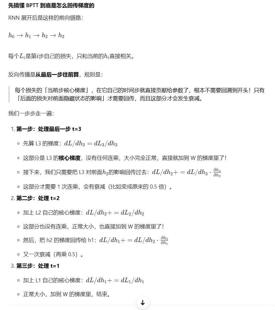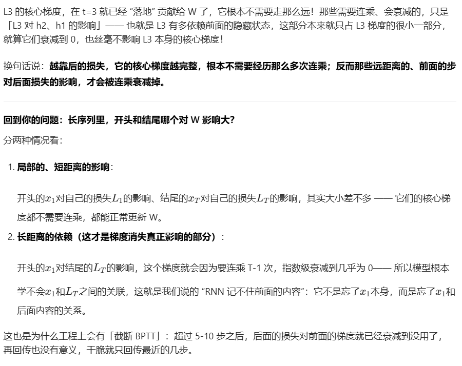 | 普通 RNN | ∏(tanh′⋅Wh),每一项都 < 1,被动衰减 | 指数衰减到 0,梯度消失 |