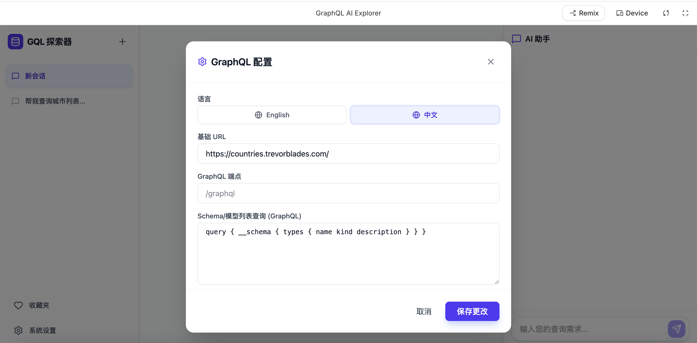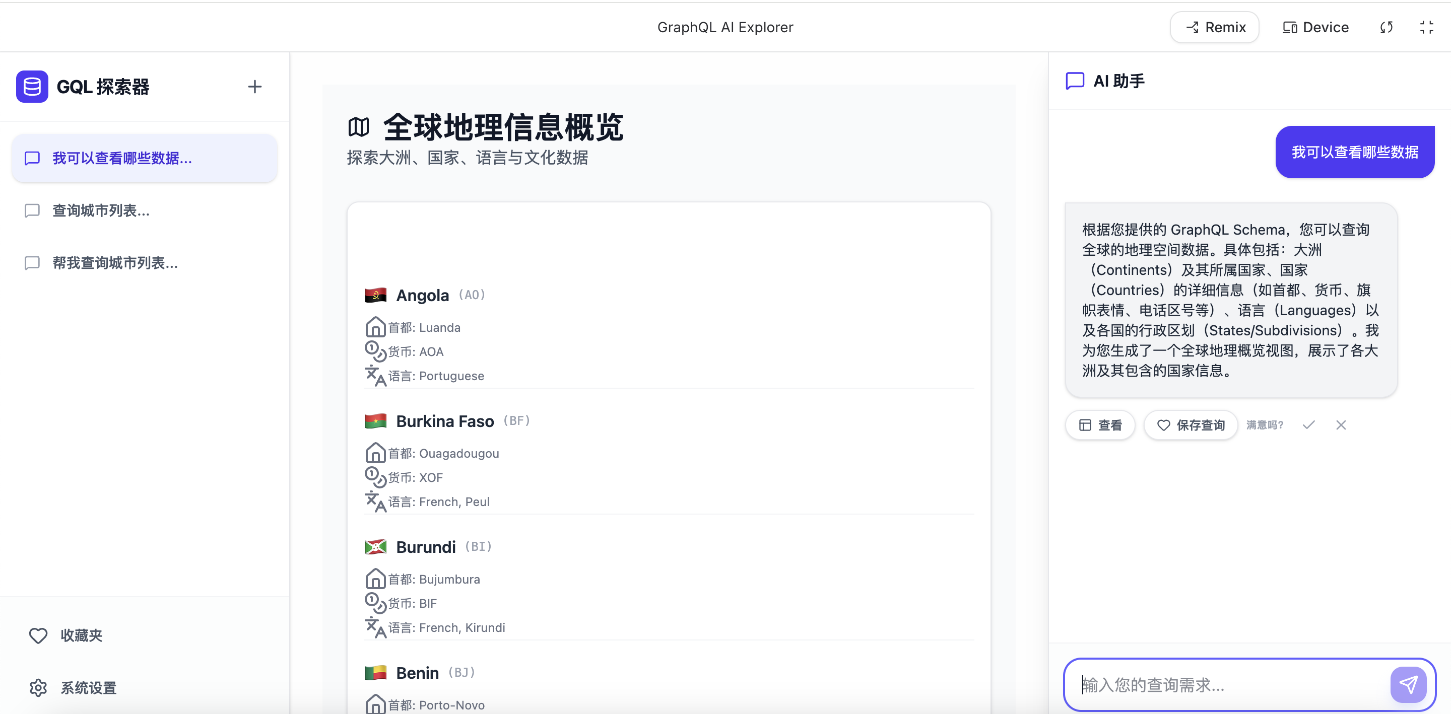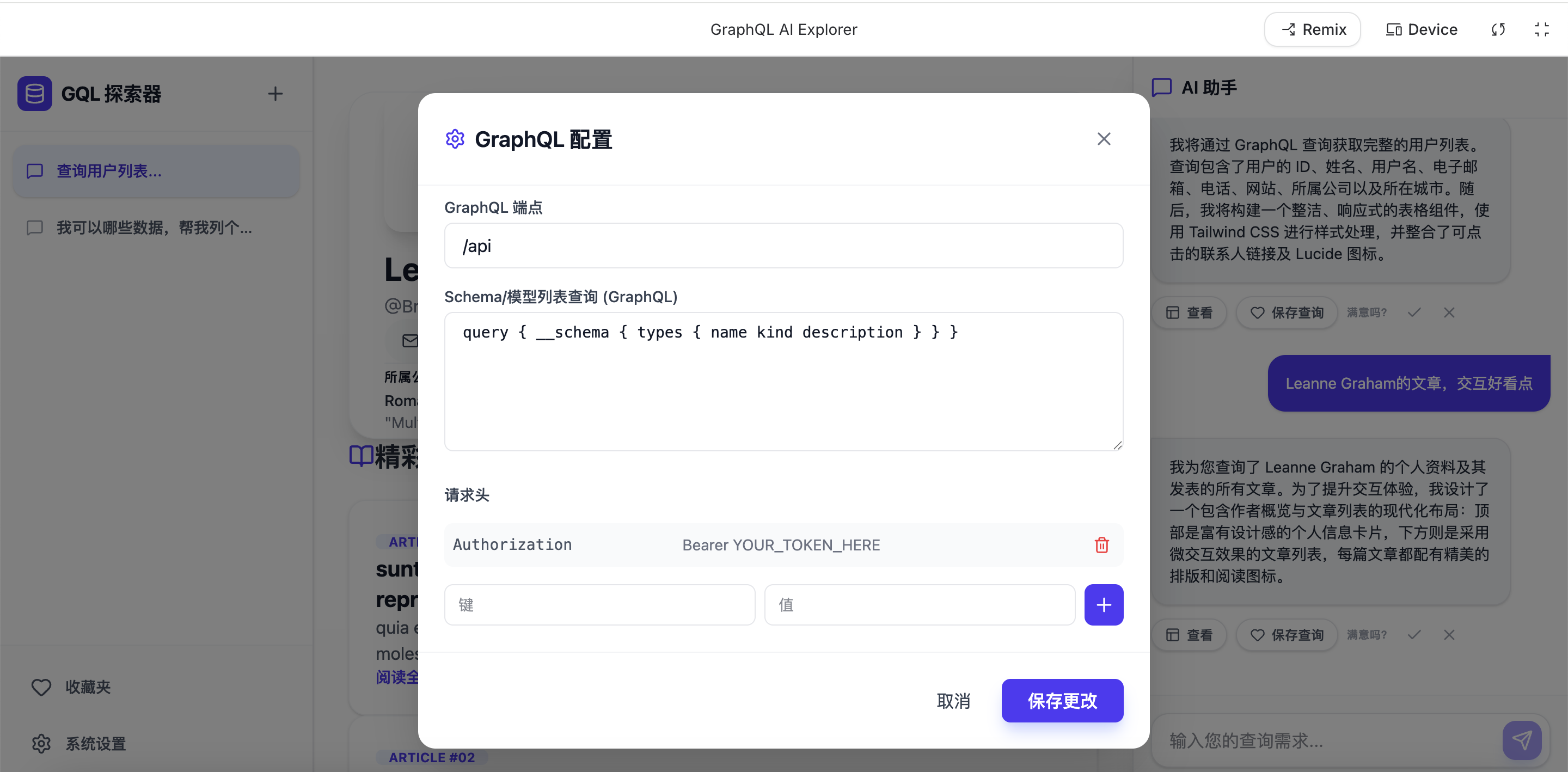 提示词就:我想要生成一个应用,布局为,左侧为列表,中间为展示区,右侧为对话,左下角为设置。列表的每一项对应一个独立的 展示区+对话。设置需要设置请求前缀,graphql查询入口,数据模型列表接口(graphql的),请求头(默认带有一个Authorization,可拓展)。对话功能为,用户期望查看某个数据,如用户,用户关联的日记等等(这是假设的,实际要根据数据模型查询),根据用户输入的期望,解析出想要查询的数据模型和参数,根据Graphql的形式查询,并且自动生成前端代码动态渲染结果,用户可以收藏此次渲染的结果,如果通个对话下同样期望有收藏的渲染结果,那么渲染收藏的样式(但数据用新的),并且询问用户此次展示样式是否满意。展示区则为展示渲染结果的地方。