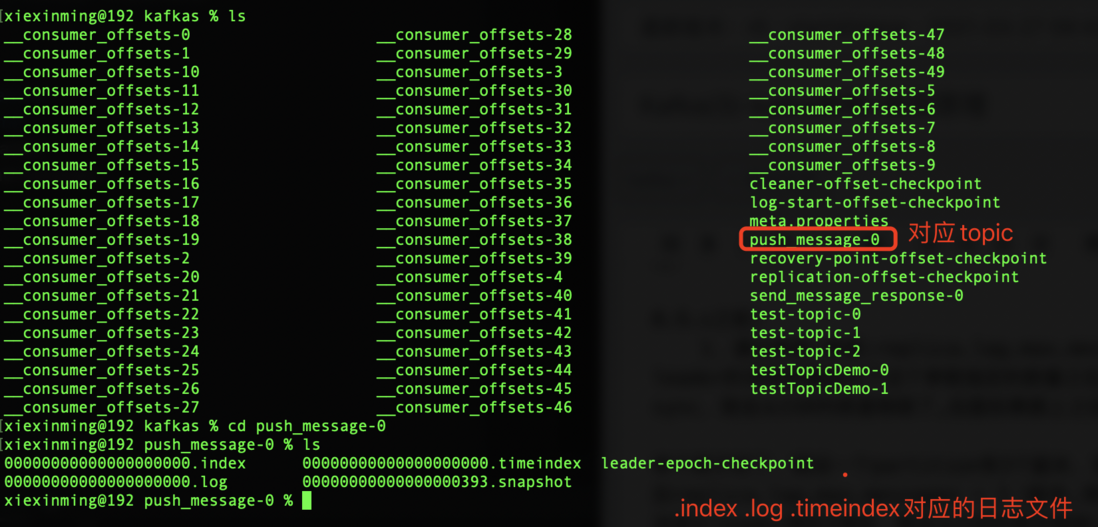 每个分区partition都有对应的目录,就是"topic-分区号"的格式,比如说有个topic叫做"order-topic",那么假设他有3个分区,每个分区在一台机器上,那么3台机器上分别会有3个目录,"order-topic-0","order-topic-1","order-topic-2"。