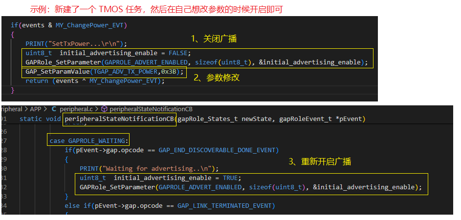 如果要在广播期间修改发射功率使用如下函数(此过程需要关闭广播 - 设置 - 再开启广播):